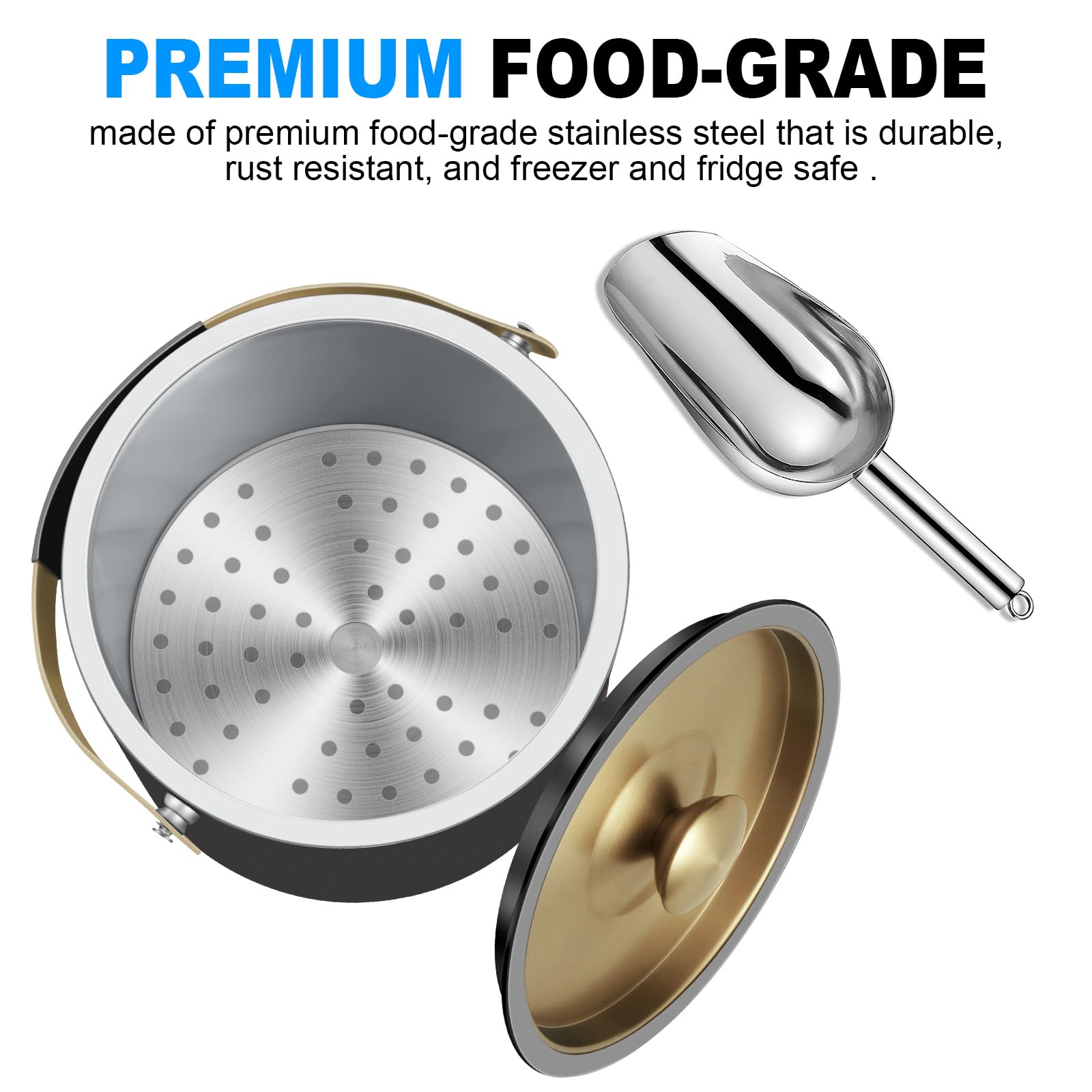- 【Easy Carry Handle & Scoop】 Our ice bucket is designed with a non-slip silicon handle that is easy to hold. Moreover, the equipped ice scoop enables you to handle ice quickly and easily.