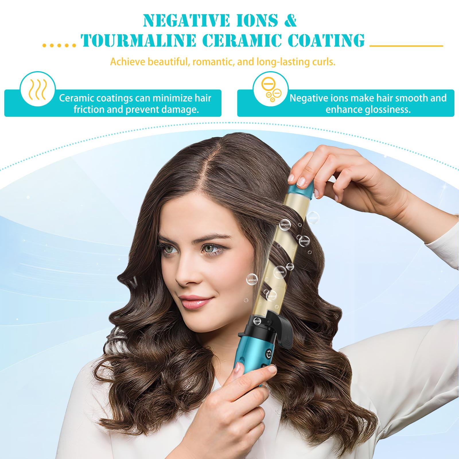 - 【3 in 1 Automatic Rotating Curling Iron Set】0.75/ 1 /1.25 inch interchangeable barrels hair curling ceramic iron and it has bidirectional automatic rotation function.The curling iron using tourmaline ceramic technology helps to create a smooth and glossy effect on hair, reduce damage caused by friction on the surface of the hair, and naturally transmit far-infrared heat and negative ions, making it easier to achieve a healthy, perfect, and multi style heat styling.