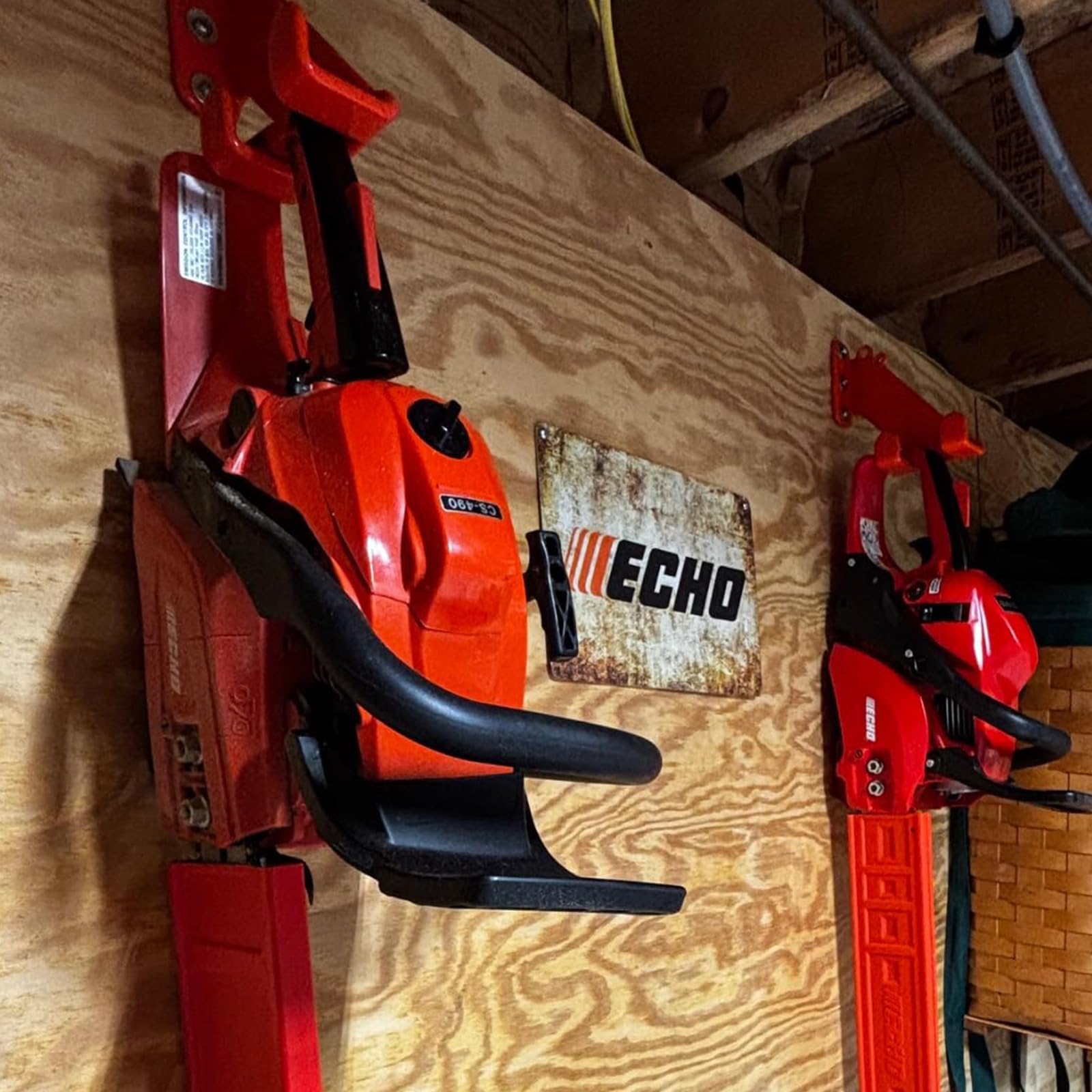 - [Space Saver] Anyone is tired of tripping over tools and misplacing the chainsaw? Iulrtba chainsaw hanger helps securely hold the saw in a vertical or horizontal position, bonus holes for keeping a file, wrench, or screwdriver, not only makes storing your chainsaw more appealing, but also makes access much easier