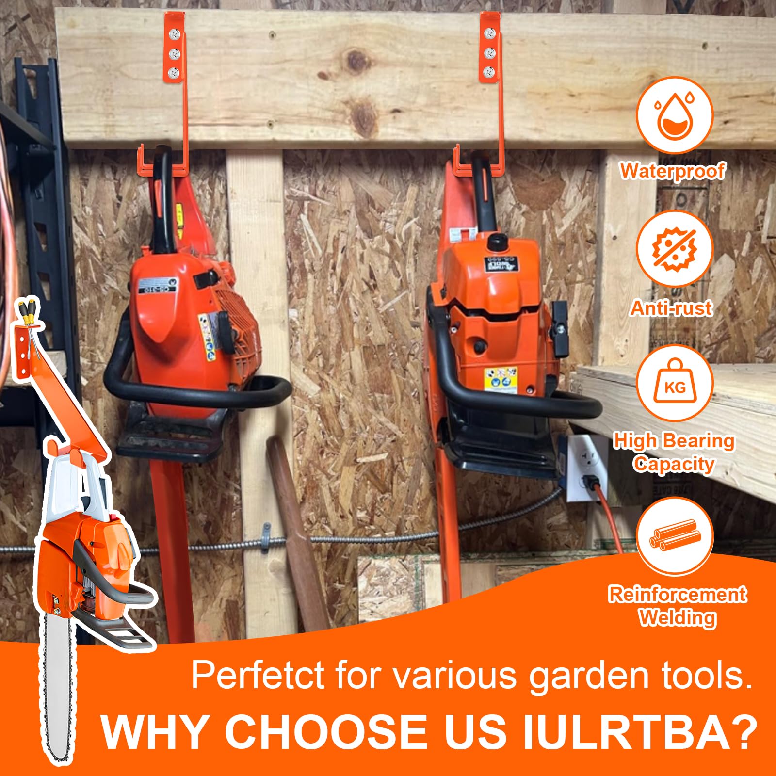 - [Heavy Duty] Iulrtba chainsaw wall hanger is constructed of 9/64" thickened 10 gauge stainless steel, which can handle up to 180 lbs and give you total confidence that your equipment is firmly stored. Each chainsaw rack is powder coated in durable orange paint, which protects the machine and your hands