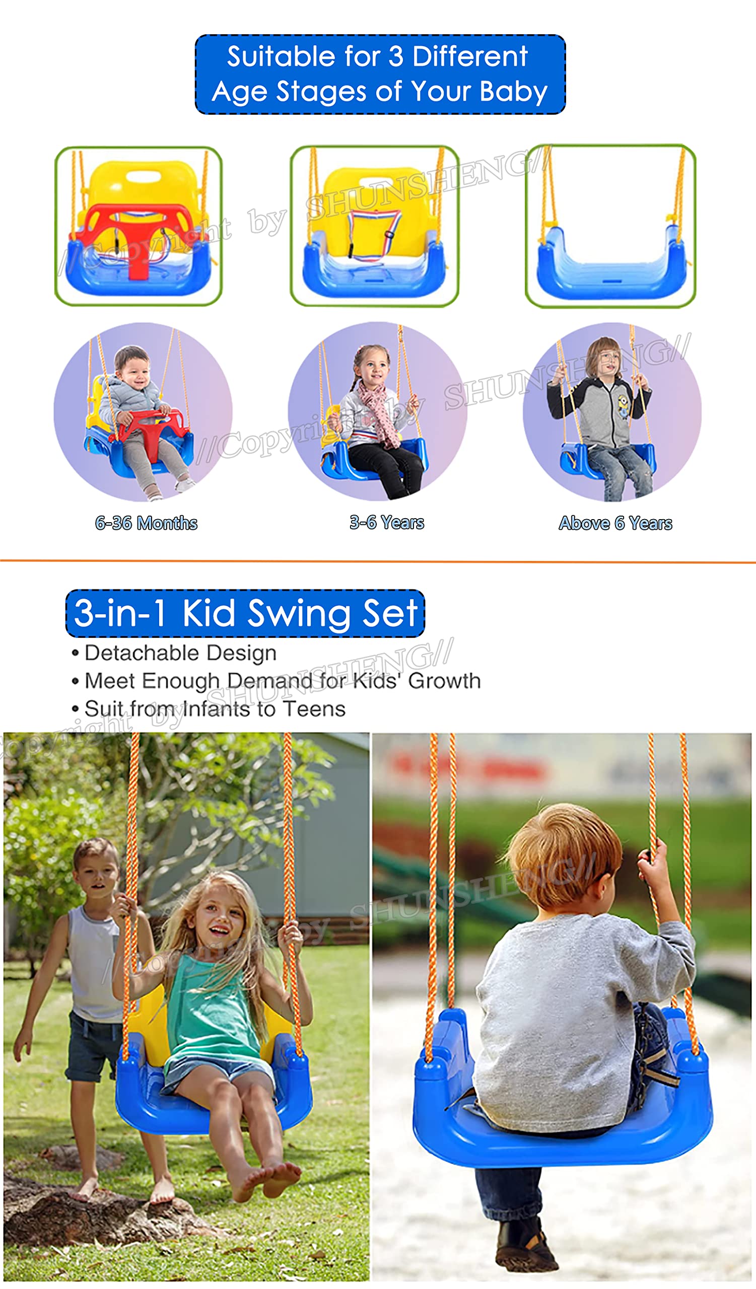 2, The swing has the design of combination of 3-in-1. Convertible to change as child grows. It suits from infants to teens.