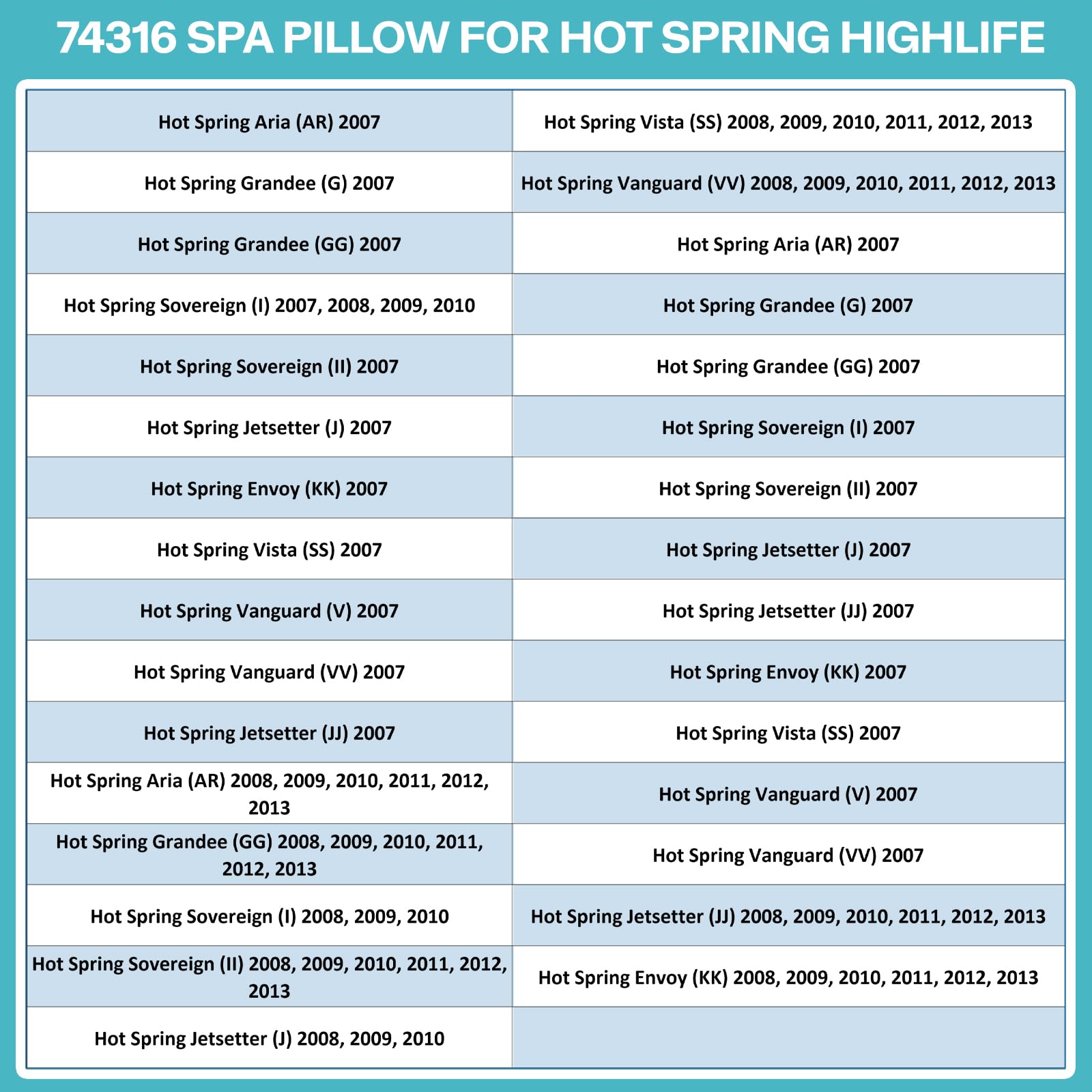 - This cool gray color pillow is the newest design and is designed for Hot Spring Highlife Series mid-year 2007 through 2013 Hot Spring spa models: Accolade, Aria, Envoy, Grandee, ILE, Jetsetter, Landmark, Prodigy, Sovereign, Vanguard, Vista. This pillow is not backward compatible (won’t fit on older s).