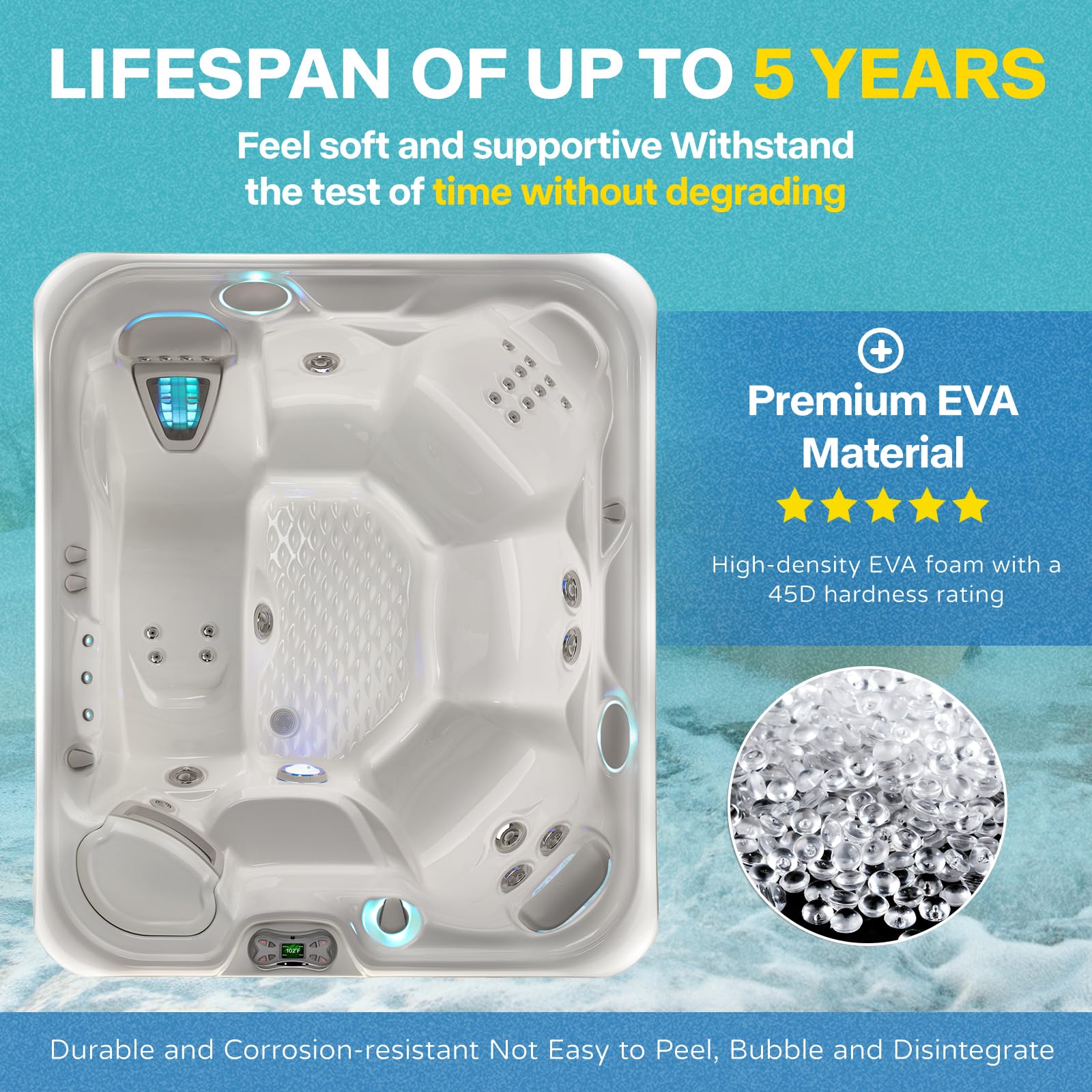 - Premium EVA Material: Crafted from high-density EVA foam with a 45D hardness rating, this spa pillow offers superior comfort and resilience. Unlike conventional materials that can peel, bubble, or disintegrate over time, our EVA foam is engineered to resist wear and corrosion, maintaining its integrity even after prolonged exposure to water and chemicals. The material's exceptional durability, combined with its water and UV resistance, ensures your Highlife spa remains a haven of relaxation.