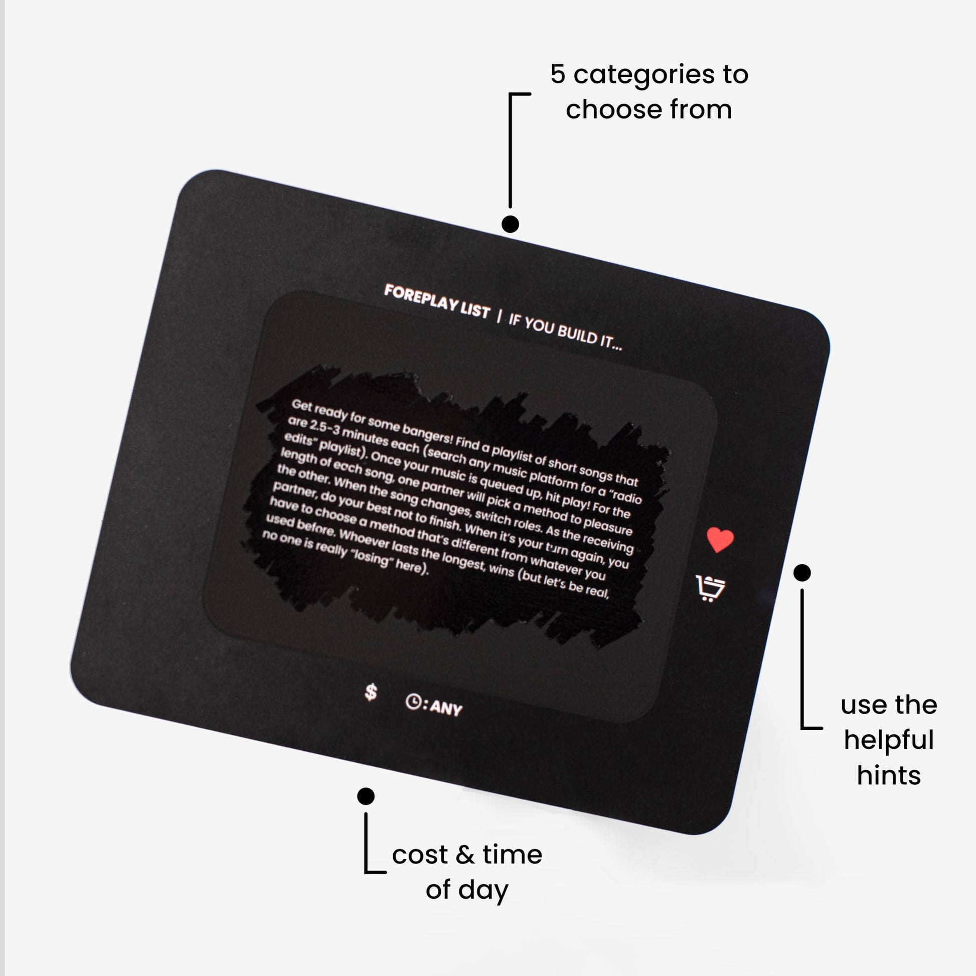 - SPICE THINGS UP: Whether it's a flirty activity, game, or a quick challenge to break you out of your routine and get you ready for the "big event," intimate experiences are what tie us together.