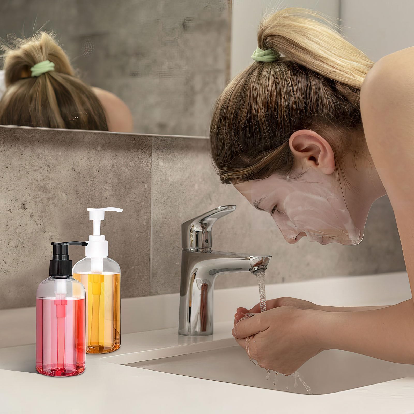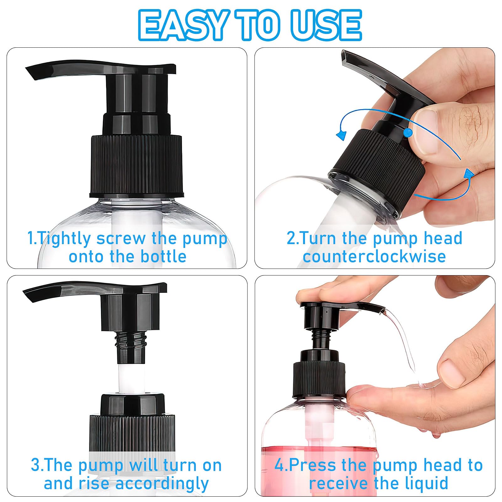 - Reliable and Leak Proof: each plastic pump bottle is equipped with a sturdy and reliable pump; When you receive a new plastic pump bottle, please turn the pump head clockwise, and the pump head will pop up a certain height to start pressing and using; When you want to carry the pump bottle dispenser on your journey, you can press the pump head to the bottom and rotate it in the opposite direction to fix the pump head, prevent leakage or dripping, facilitate carrying, and avoid waste