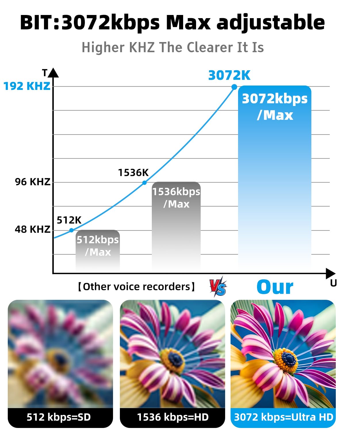 - ☑️ 【3072Kbps Max Adjustable】: This recorder offers versatile bit rate adjustments (512Kbps/768Kbps/1024Kbps/1536kbps/3072kbps) for different scenarios, providing clearer sound and greater flexibility in recording options.