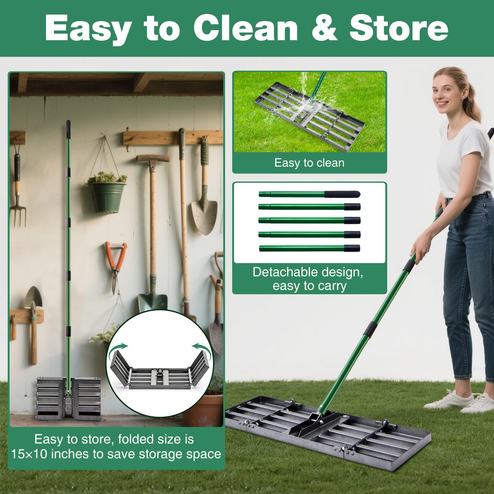 - 【Easy Storage – Folds to Just 38x25cm】No more wrestling with bulky tools! Our foldable design disassembles in seconds for compact storage. The handle breaks down into 5 lightweight sections, and the rake head detaches—fitting in tight shed corners or car trunks. Weighing just 5kg, it’s easy to carry to job sites. Perfect for homeowners with limited storage or contractors needing a portable solution.