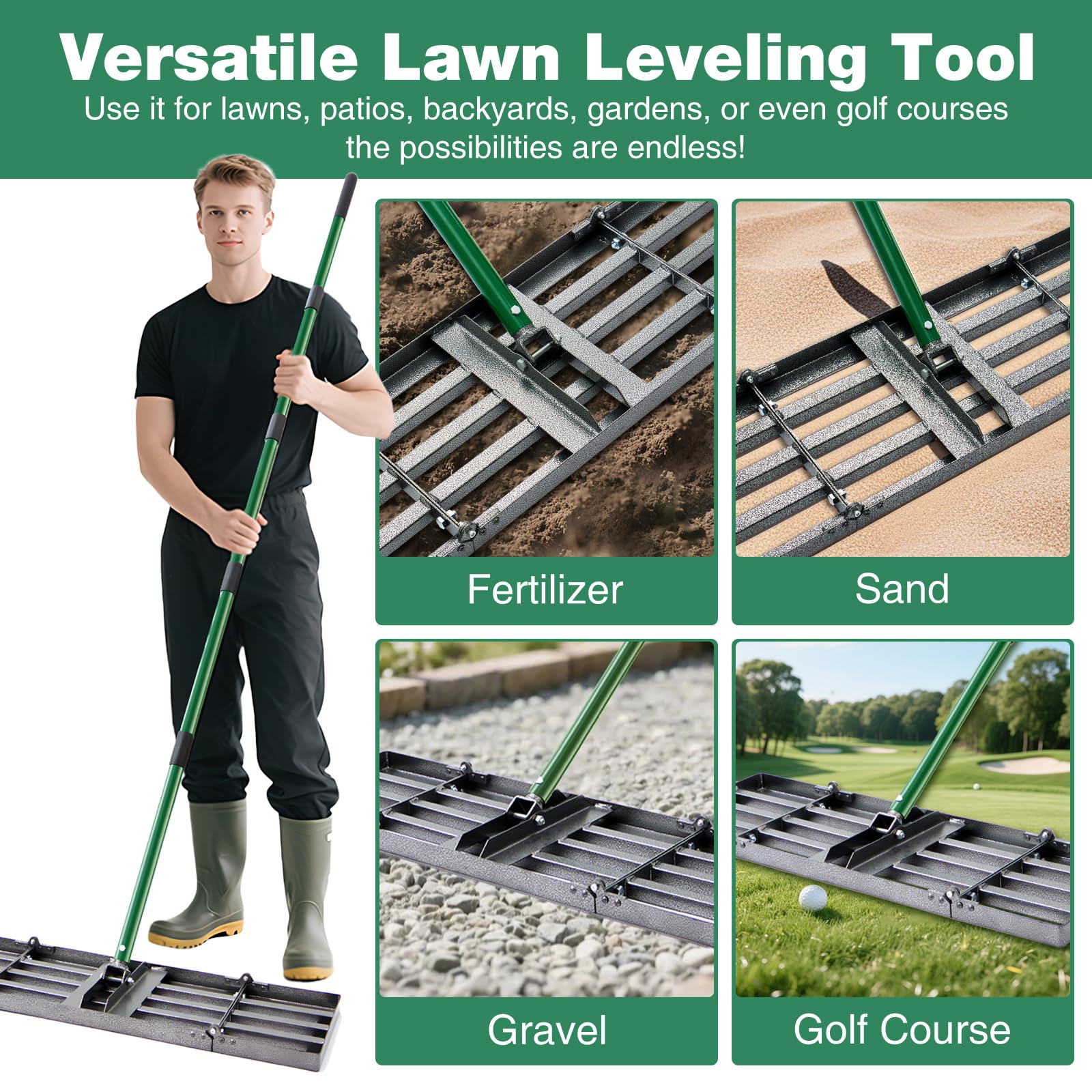 - 【Multi-Surface Versatility】More than just a lawn rake, this tool excels at: ①Lawn Care: Level bumps, fill holes, and top-dress with soil/sand. ②Golf Courses: Smooth putting greens and bunkers with precision. ③Landscaping: Grade gravel driveways or spread mulch in garden beds. The smooth-edged design won’t tear grass, while the wide surface area evenly distributes materials.
