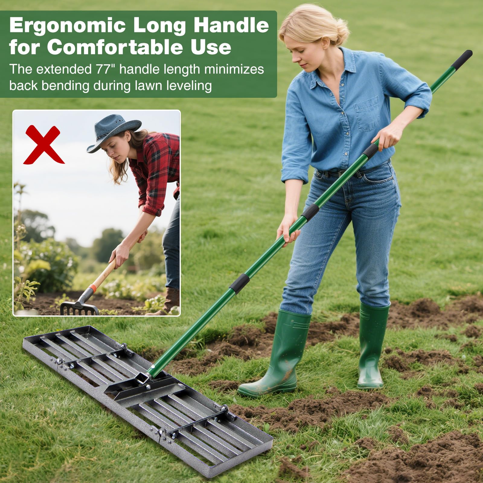 - 【Heavy-Duty 76cm Wide Leveling Head】Cover more ground with less effort! Our extra-wide 76cm steel leveling rake is designed to maximize coverage. Whether you're spreading topsoil, smoothing sand, or leveling gravel, this rake reduces passes by 50% compared to standard lawn leveler, saving you time and energy. Perfect for large lawns, golf course maintenance, or backyard, ensures professional-grade leveling without backbreaking labor.
