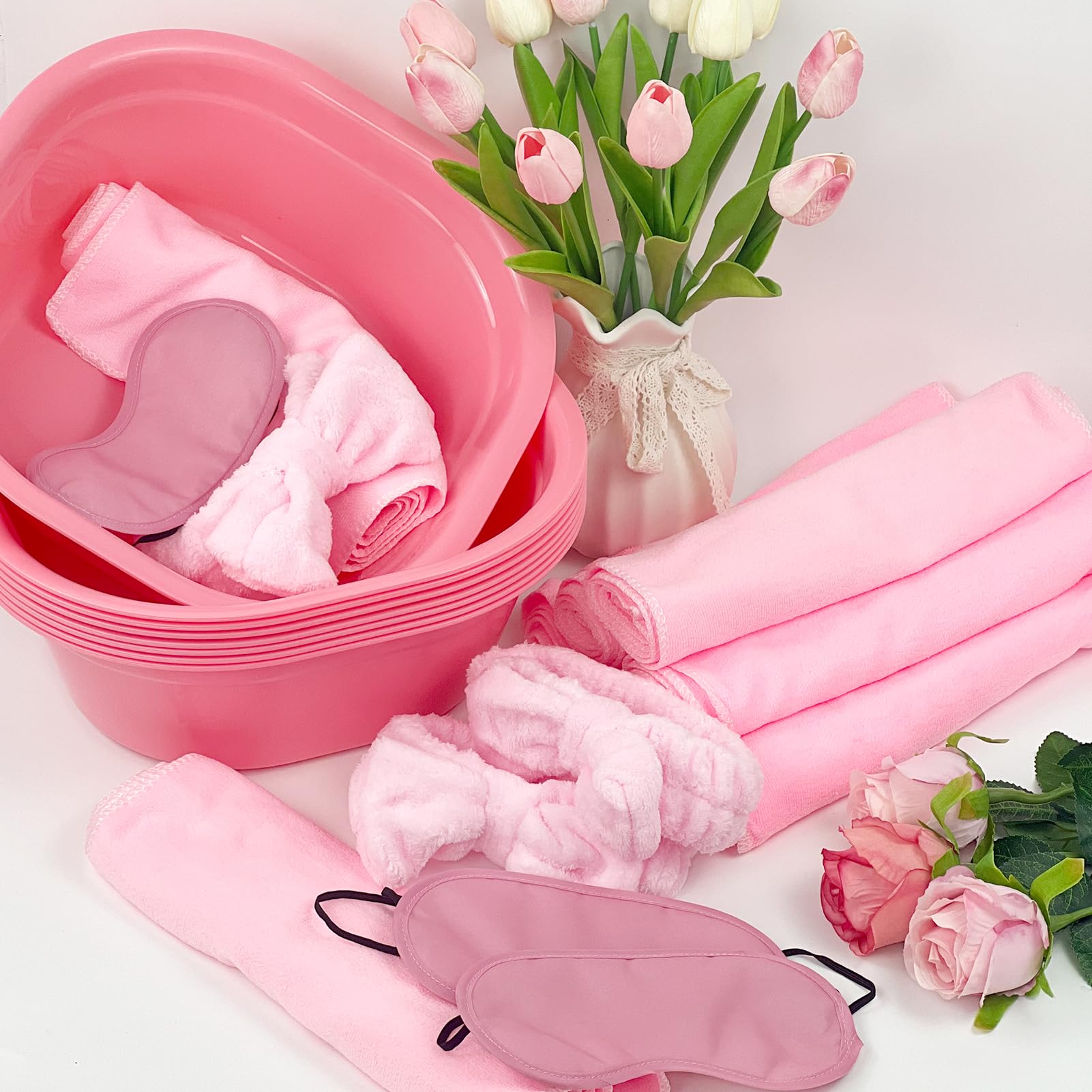 - Easy to Use and Clean: The foot soaking tubs measure 12x12x4.1 inches, towels are 27.6x11.8 inches, hairbands are 7.1x2 inches, and eye masks are 7.5x3.3 inches. All items are easy to clean and reusable.