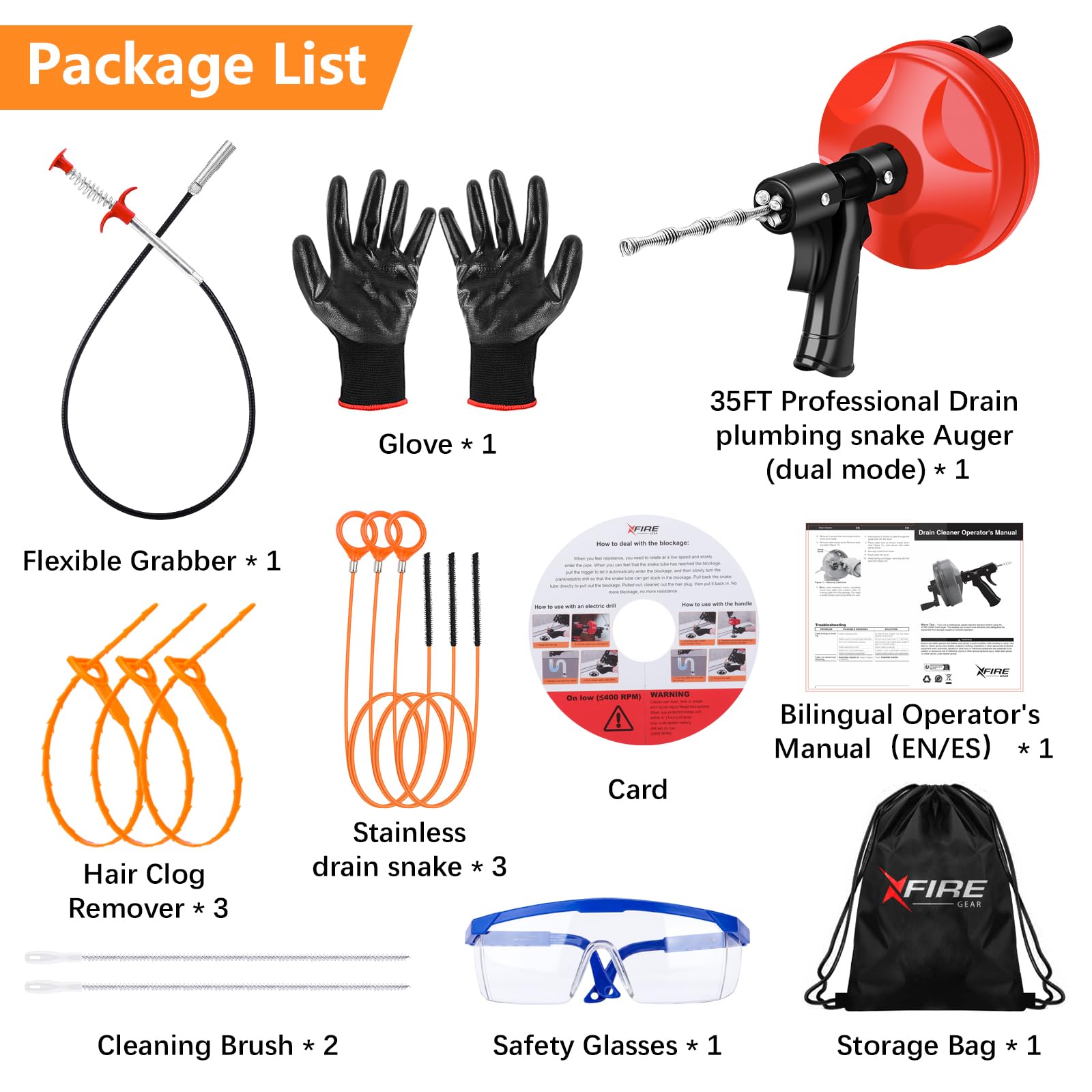 - 【25FT Plus Drain Snake Tools】XFIRE-GEAR 35 FT Drain Snake is made for home use, it can quickly clearing debris from the most stubborn drains such as hair, food residue, toilet paper, grease. plumbing snake drain auger includes 35ft Drain plumbing snake Auger(dual mode)- Flexible Grabber - 2pcs Cleaning Brush - 6pcs Hair Clog Remover - Glove&Safety Glasses - Bilingual Operator's Manual(EN/ES) - Storage Bag