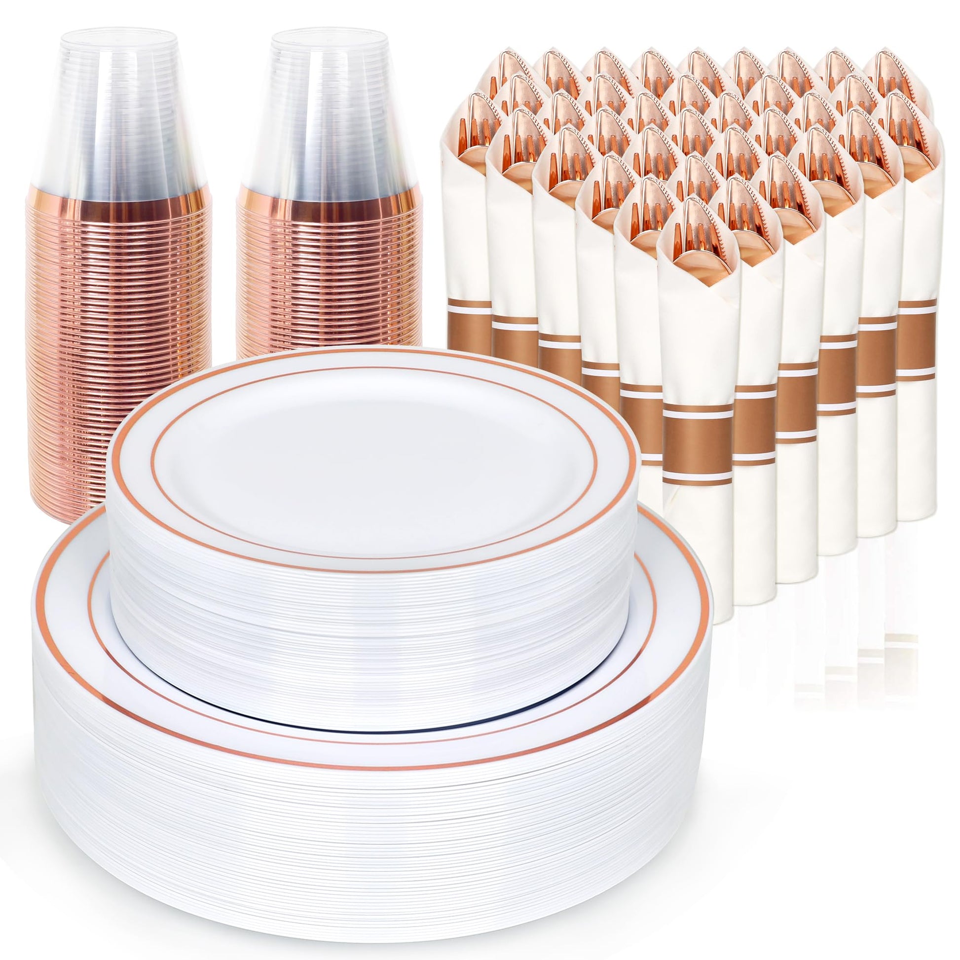 350 Piece Dinnerware Set for Wedding & Party,50 Guest RimPlastic Plates,50 Plastic Silverware,50 Cups,50 Linen Like Napkins (Rose Gold)
