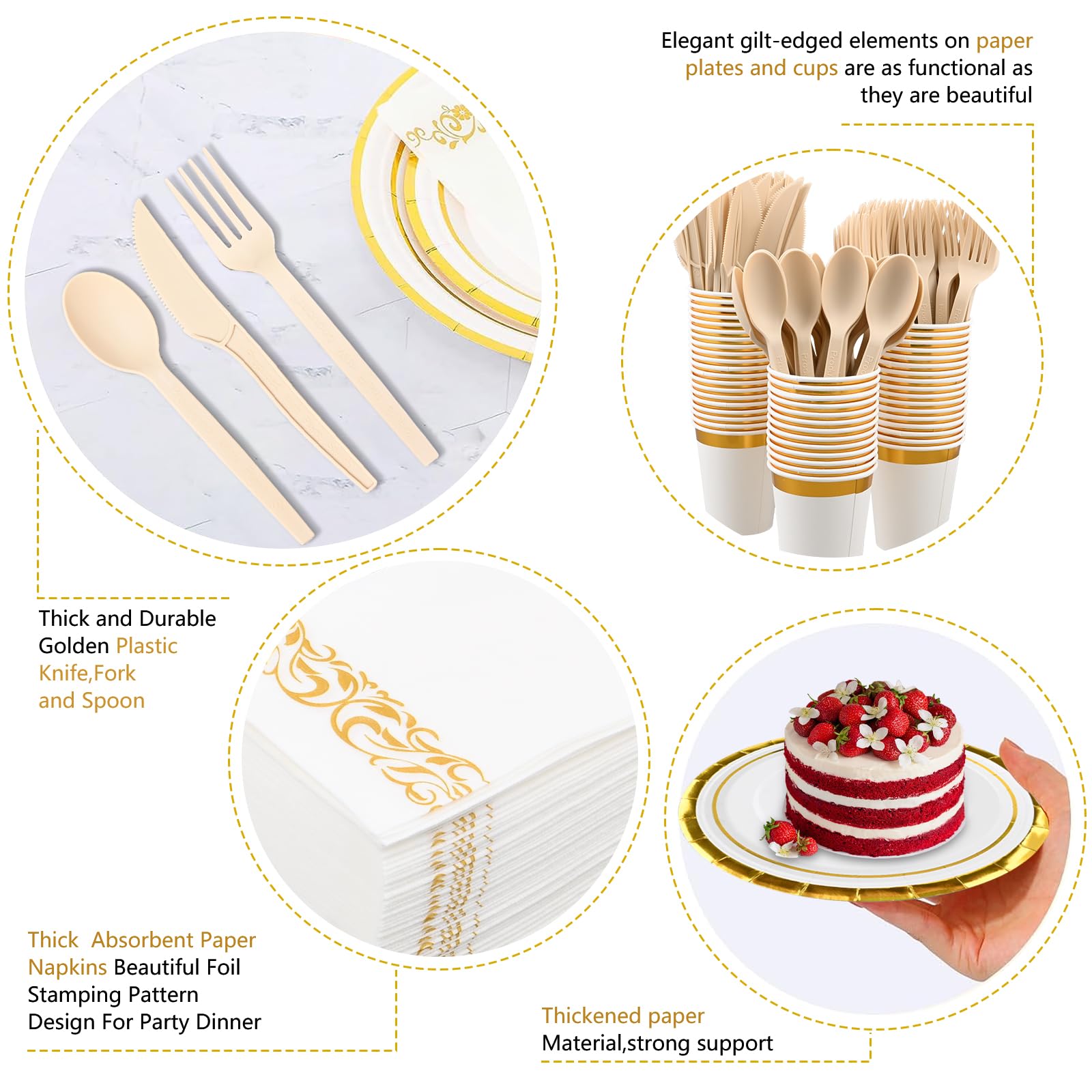 - Design: The premium paper tableware features an overall gold tone and a smooth white plate with gold strokes for a sophisticated and elegant style, easily catch the attention of your guests and they will love it.