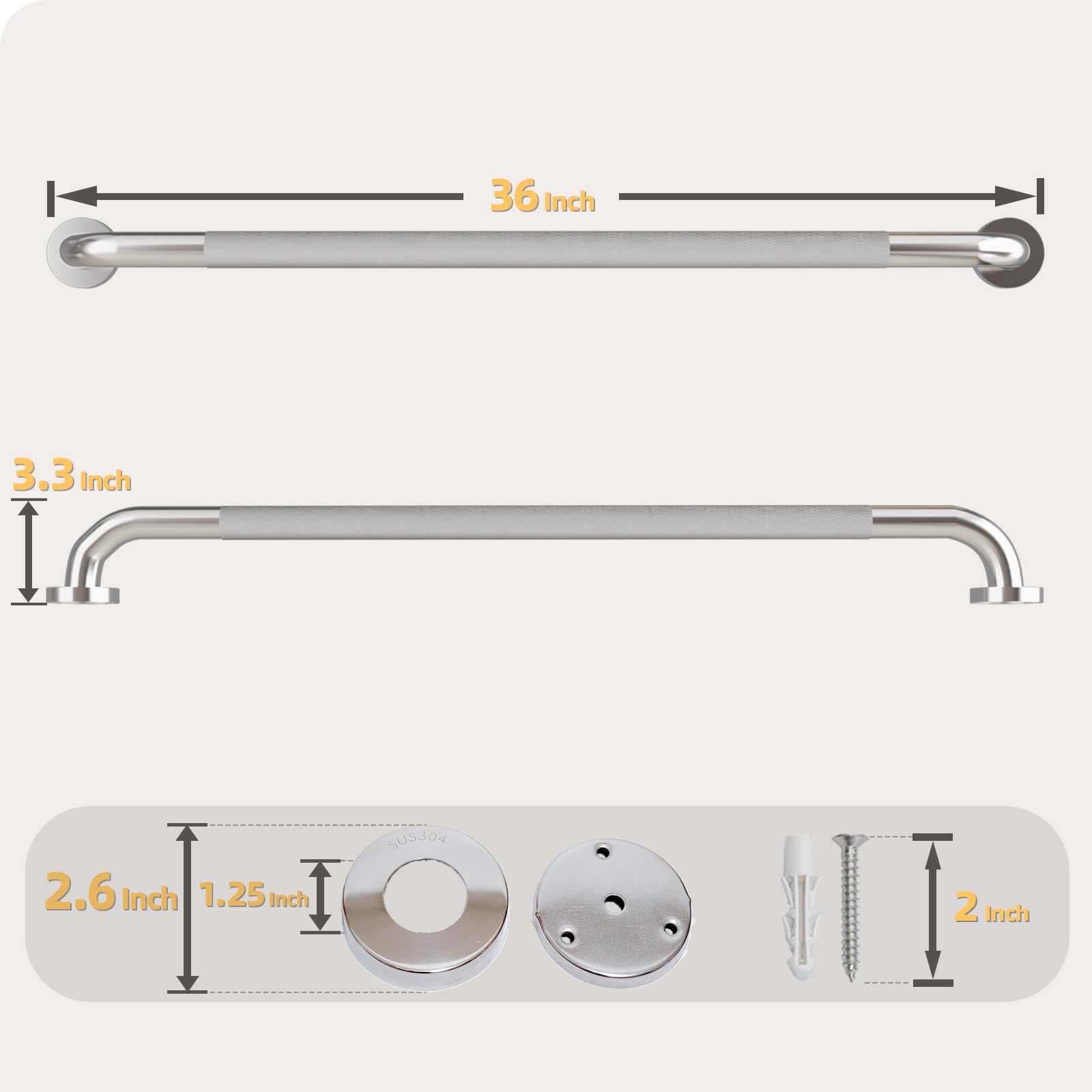 - 【EASY TO CLEAN SAFETY RAIL】The 36" brushed nickel finish of this bathroom grab bar resists fingerprints, water spots, making it easy to keep clean and looking new. Simply wipe with a damp cloth to maintain its sleek, polished appearance, ensuring long-lasting hygiene and aesthetics in your bathroom.These shower grab bars also make a thoughtful and practical gift for family and friends.