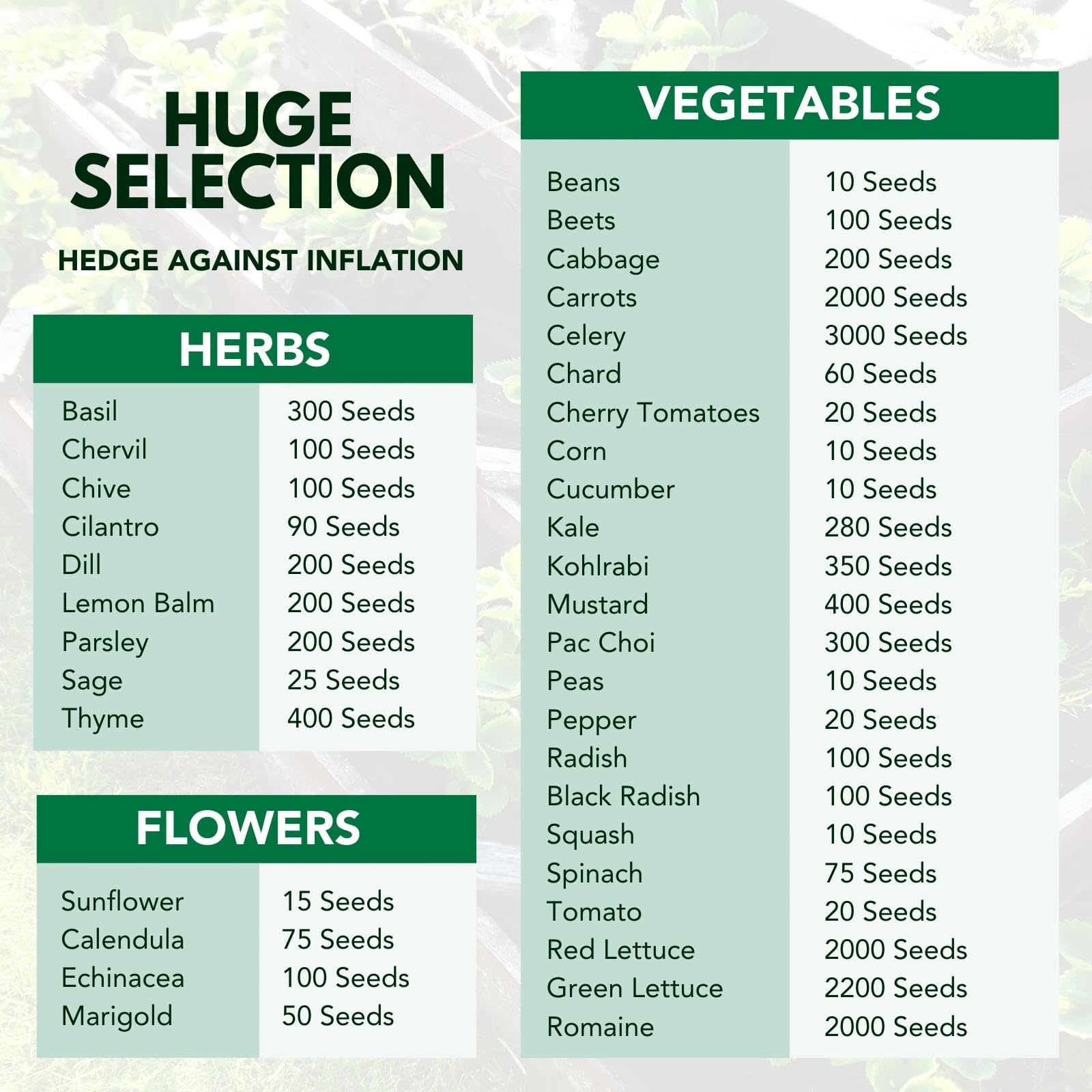 - 🌱 SEEDS INCLUDED 🌱 Cabbage, Celery, Cucumber, Peas, Radish, Tomato, Beets, Carrots, Lettuce, Kale, Romaine, Basil, Chive, Cilantro, Lemon Balm, Chard, Chervil, Dill, Mustard, Sage, Thyme, Beans, Calendula, Echinacea, Marigold, Sunflower, Cherry Tomato, Corn, Kohlrabi, Pac Choi, Pepper, Squash, & More.