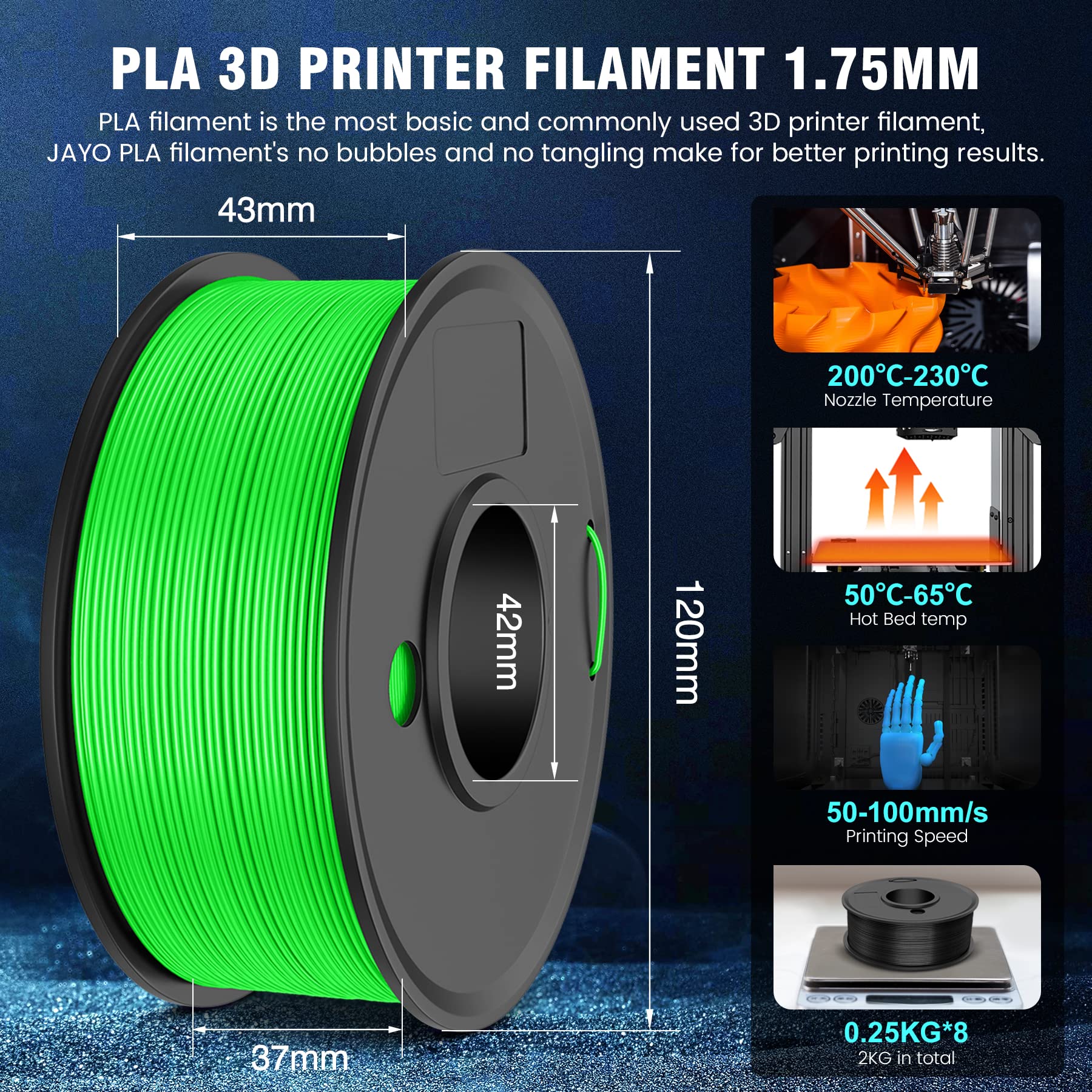 - 【1.75mm Filament Diameter】JAYO PLA 3D printer filament has 1.75 mm diameter, dimensional accuracy +/- 0.02 mm, accurate diameter making it suitable for almost FDM 3D printers.