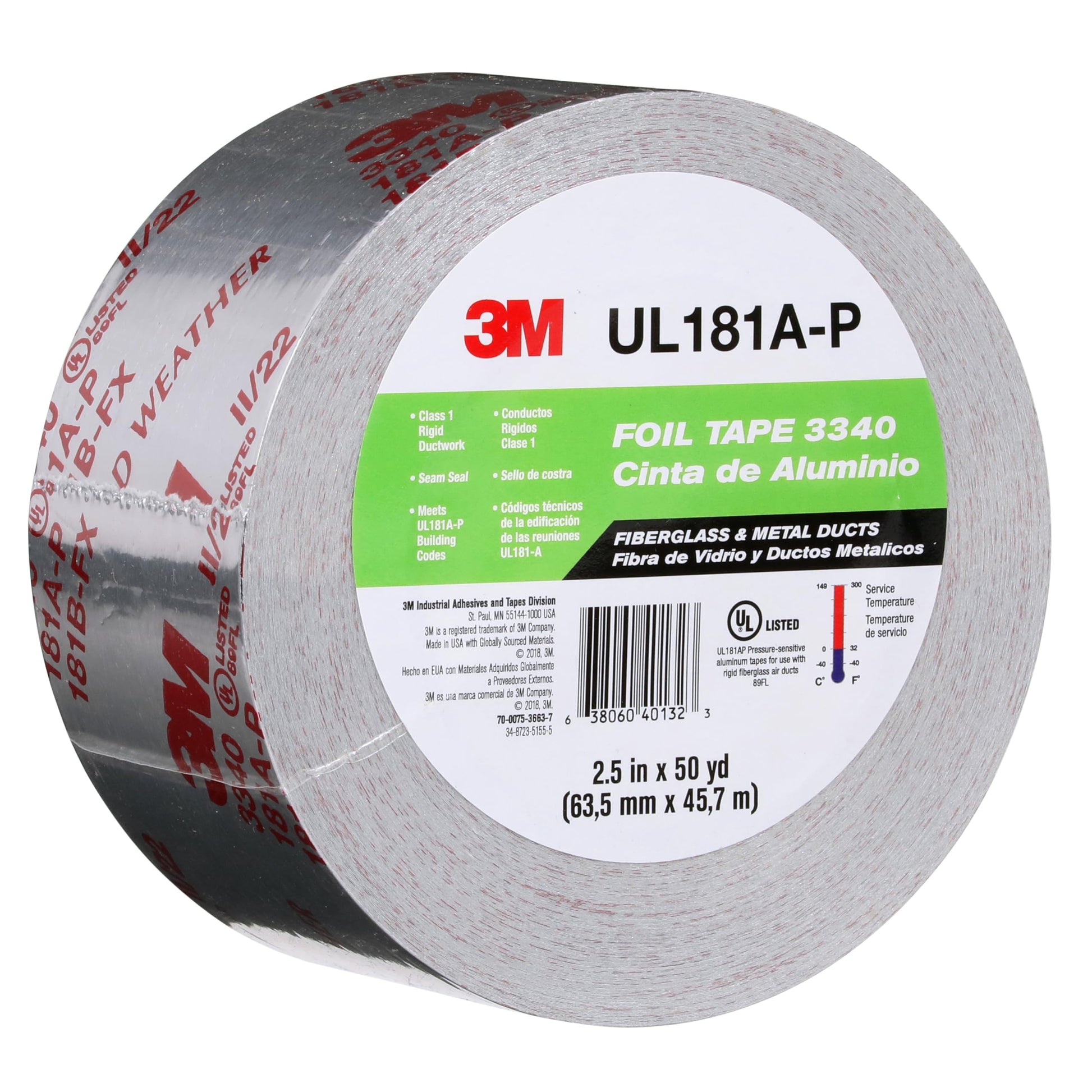 Details: When sealing ducts and other surfaces for heating, ventilation and air conditioning systems (HVAC), it's essential to have a strong, long-lasting foil tape that can stand up well to hot and cold temperatures. The 3M Foil Tape 3340 has the combination of 2.0 mil aluminum foil backing and strong, pressure sensitive acrylic adhesive that gives our tape a superb operational temperature range of -40°F (-40°C) to 300°F (149°C) making it ideal for sealing rigid fiberglass duct boards and flexible air duct systems. The foil backing also serves as an excellent barrier against moisture, dust and many chemicals — making it strong, durable and long-lasting. The very low moisture vapor transmission rate makes the tape a good sealant and the acrylic adhesive supplies superior temperature and UV resistance to give you a strong, lasting and reliable bond. It also has an easy releasing poly coated kraft paper liner to protect the adhesive and keep the tape ready for use. 3340 tape meets requirements for UL 181 A-P and UL 181 B-FX Listings as a measure of reliability and quality standards. 3M Foil Tape 3340 is used in a variety of applications including heating ventilation air conditioning (HVAC), duct closure, vapor seal on reinforced fiberglass duct board, rigid fiber glass duct board, and flexible air ducts and air connectors across a number of industries, including: transportation, specialty vehicle, metalworking, construction, automotive, military and government, general industrial, MRO, electronics and aerospace.