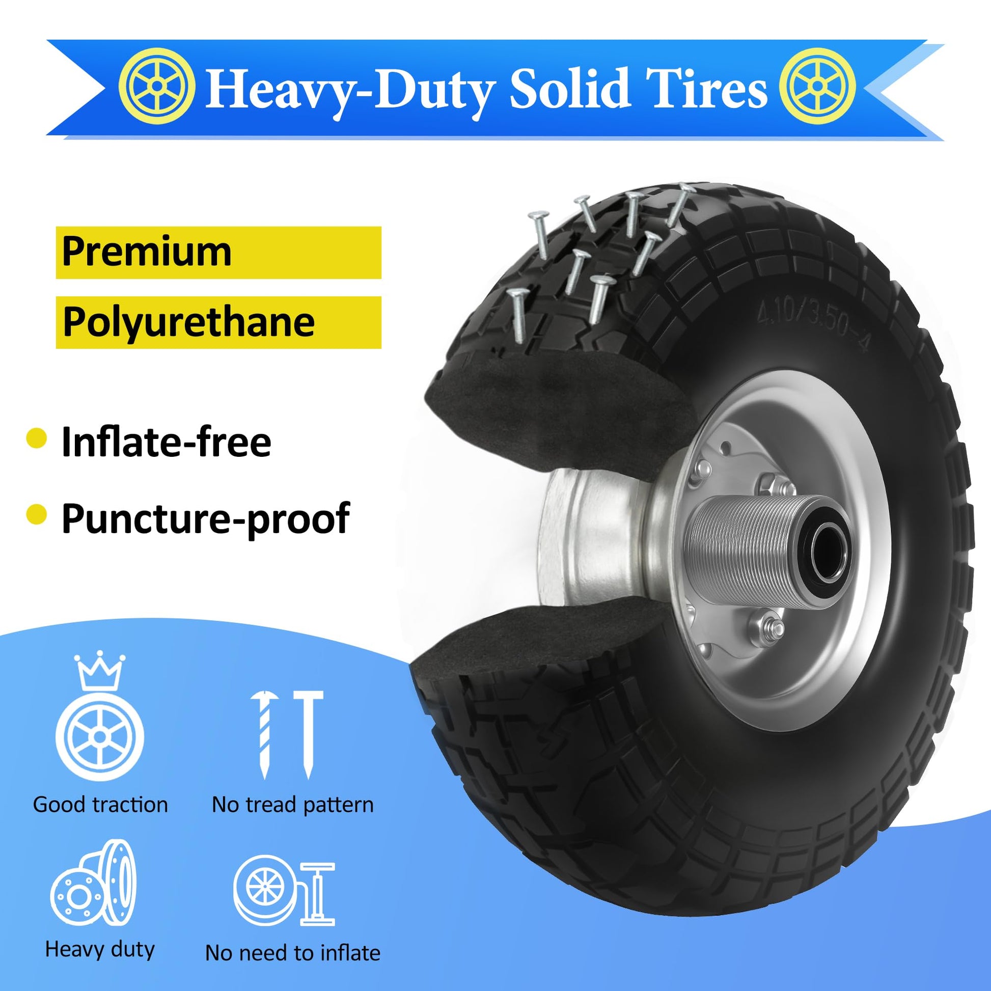 - Solid Tires and Wheels: No Flat Tire Worries Forever!Prevent From Getting Punctured or Deflated.Keep You Away From the Trouble of Inflating Tires Frequently.More Reliable, More Durable!Why Spend Hundreds for a Cart When You Can Just Change the Wheels