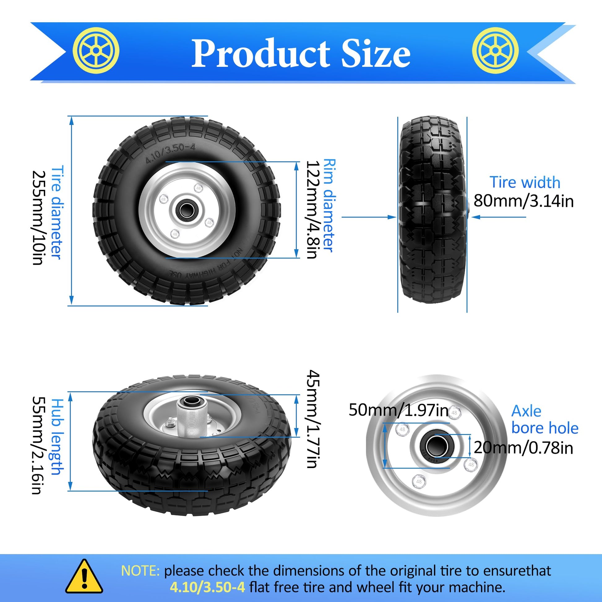 - Size: Model:4.10/3.5-4 Tires and Wheels Flat Free;Diameter 10'';Tire Width 3.1"; Axle Bore Diameter: 5/8";hub offset:2.1". Please Check Carefully Before Buying To Make Sure the Tires Match.Suitable for Dynamic Load-Bearing, Not Suitable for Static Load-bearing