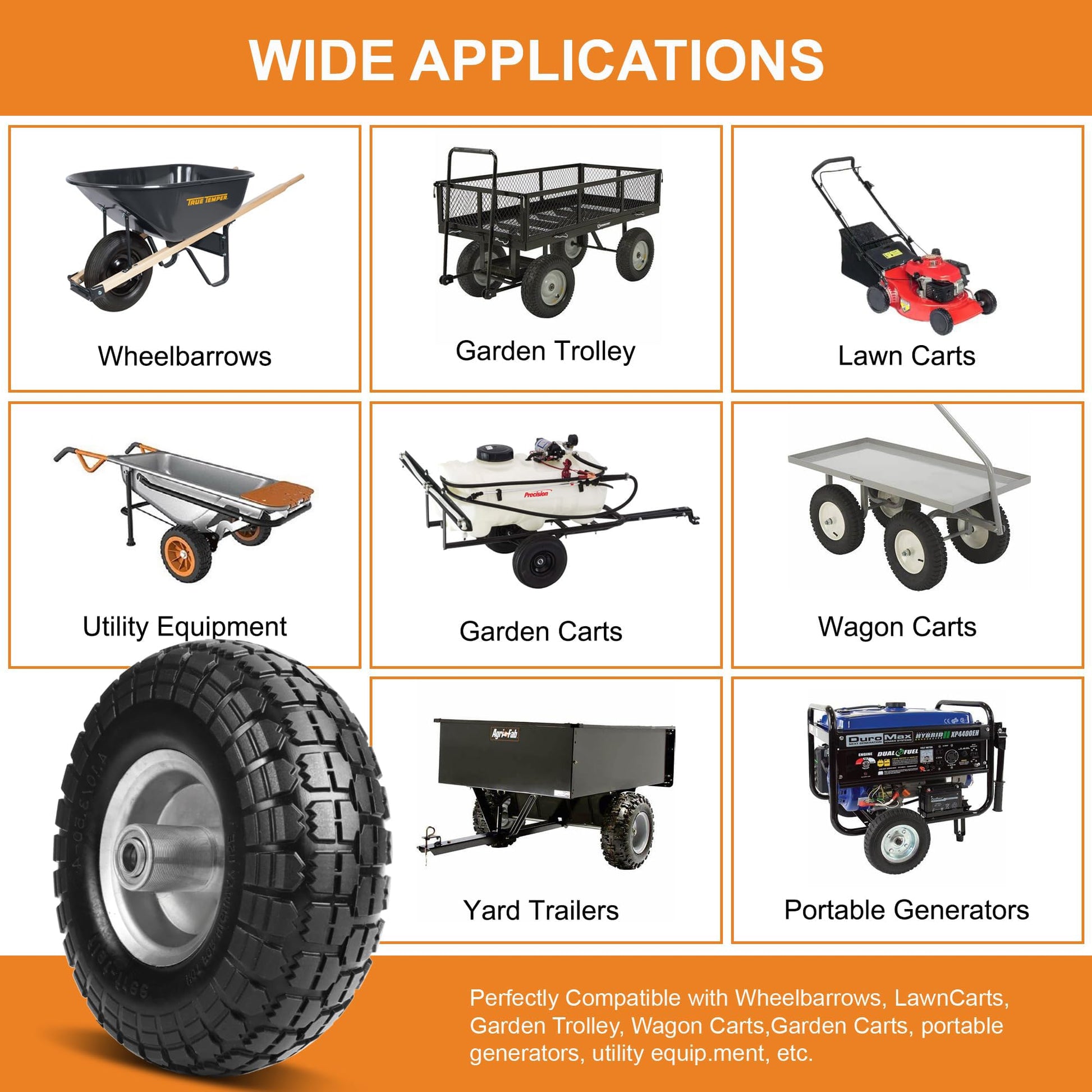 - UNIVERSAL AND EASY TO INSTALL : 10 inch is one of the most common sizes of tires used for both commercial and home use. making them perfect for various uses such as hand trucks, gorilla cart, garden carts, wagons, yard cart , power dolly , and lawn mower trailer , dump barrow , and more. The 4.10/3.50/4 tire and wheel assembly is easy to install and requires no maintenance.