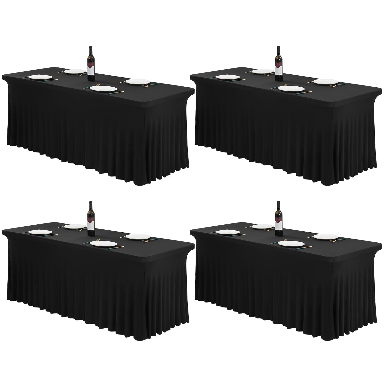 - 🎁 Premium Spandex Stretch Table Skirt: Our table skirt set includes 4 pack black 6ft spandex fitted tablecloth and table Skirt. Our table covers are 72'' x30''x30''. This table skirt is made of high-quality elastic spandex fabric (95% polyester and 5% spandex), with a fine stitching design, without any loose threads or pilling; And the fabric has good elasticity and can be stretched in any direction without deformation.
