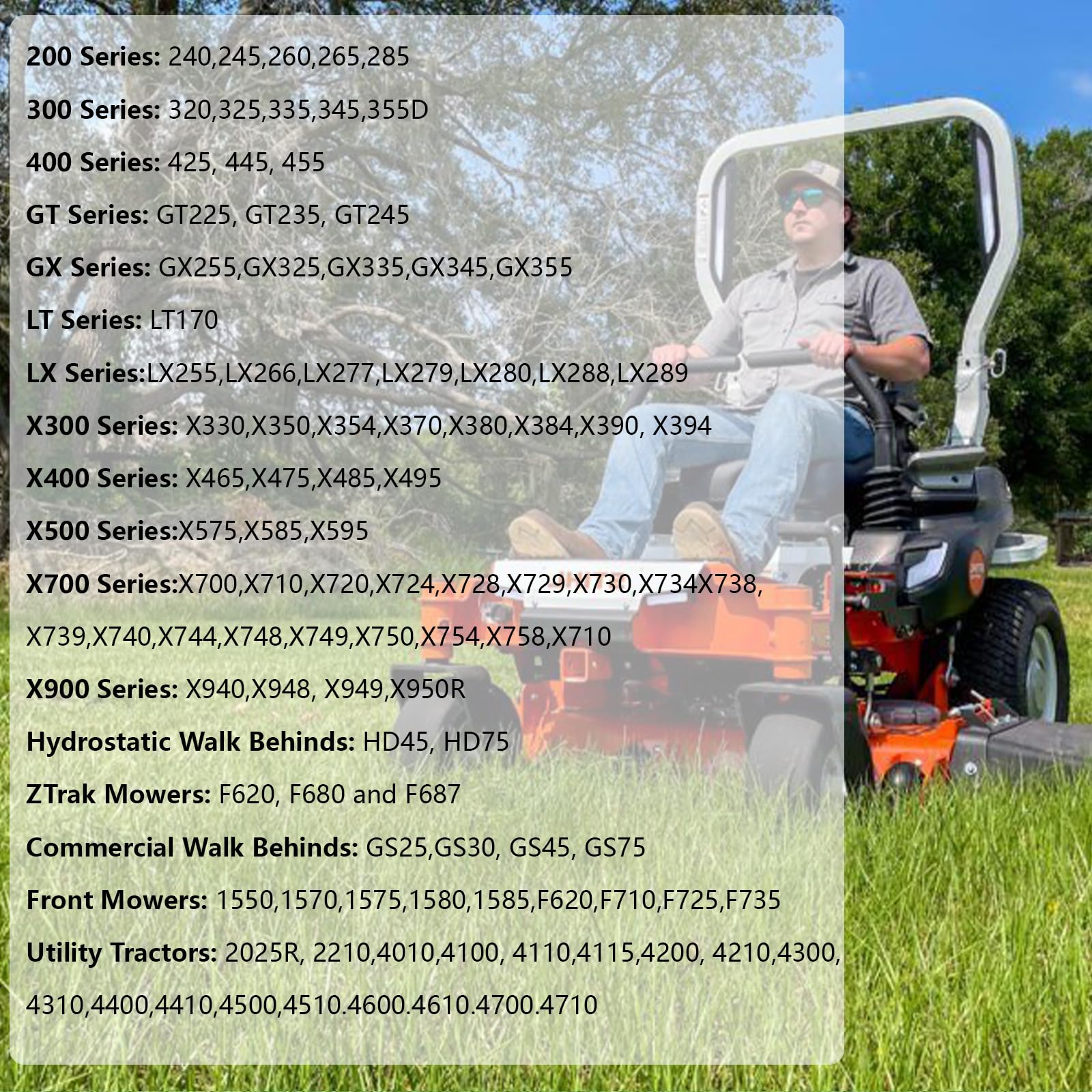 - Wide Application: HD45, HD75 hydrostatic walk behinds; F620, F680 and F687 mowers; GS25, GS30, GS45, GS75 commercial walk behinds; 1550, 1570, 1575, 1580, 1585, F620, F710, F725, F735 front mowers; 2025R, 2210, 4010, 4100, 4110, 4115, 4200, 4210, 4300, 4310, 4400, 4410, 4500, 4510, 4600, 4610, 4700, 4710 utility tractors.
