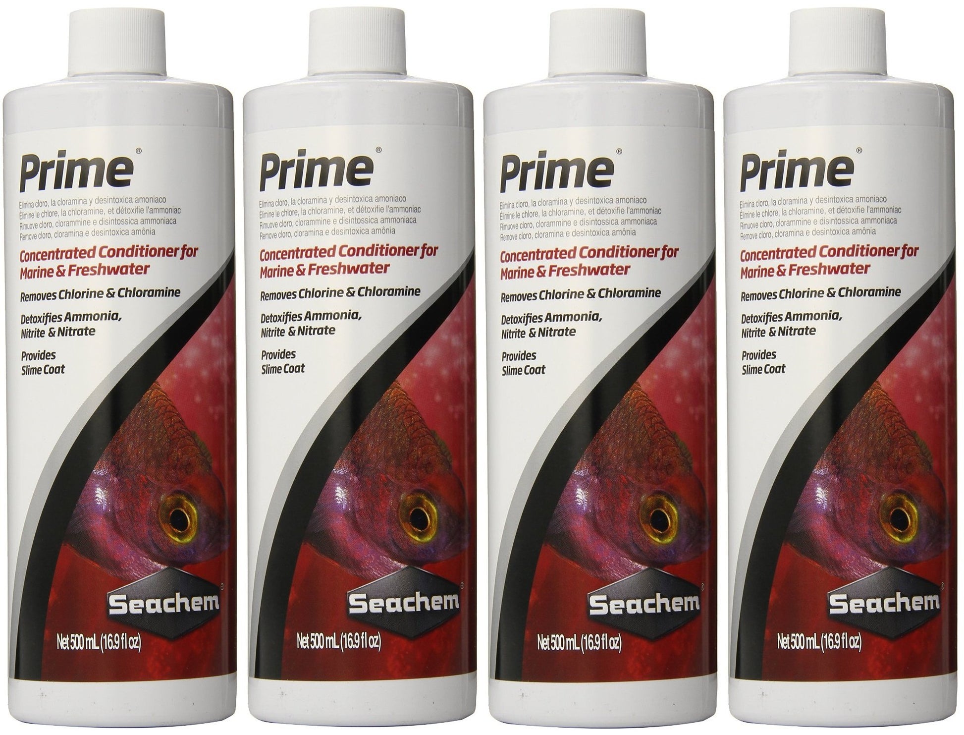 Details: Prime is the complete and concentrated conditioner for both fresh and salt water. Prime removes chlorine, chloramine and ammonia. Prime converts ammonia into a safe, non-toxic form that is readily removed by the tanks biofilter. Prime may be used during tank cycling to alleviate ammonia/nitrite toxicity. Prime detoxifies nitrite and nitrate, allowing the biofilter to more efficiently remove them. It will also detoxify any heavy metals found in the tap water at typical concentration levels. Prime also promotes the production and regeneration of the natural slime coat. Prime is non-acidic and will not impact pH. Prime will not overactivate skimmers. Use at start-up and whenever adding or replacing water. Nearly all companies manufacture a product that removes chlorine. None of those, however, can compare in quality, concentration, or effectiveness to Seachems flagship product: Prime. Prime is the second most concentrated dechlorinator on the market after our own aquavitro alpha. A single 100 mL bottle will treat 1000 US gallons of tap water. Prime will remove both chlorine and chloramines from municipal water supplies. Prime also contains a binder which renders ammonia, nitrite, and nitrate non-toxic. It is very important to understand how those two functions work together. All dechlorinators operate through a chemical process known as reduction. In this process, toxic dissolved chlorine gas (Cl2) is converted into non-toxic chloride ions (Cl-). The reduction process also breaks the bonds between chlorine and nitrogen atoms in the chloramine molecule (NH2Cl), freeing the chlorine atoms and replacing them with hydrogen (H) to create ammonia (NH3). Typically, dechlorinators stop there, leaving an aquarium full of toxic ammonia! Seachem takes the necessary next step by including an ammonia binder to detoxify the ammonia produced in the reduction process.