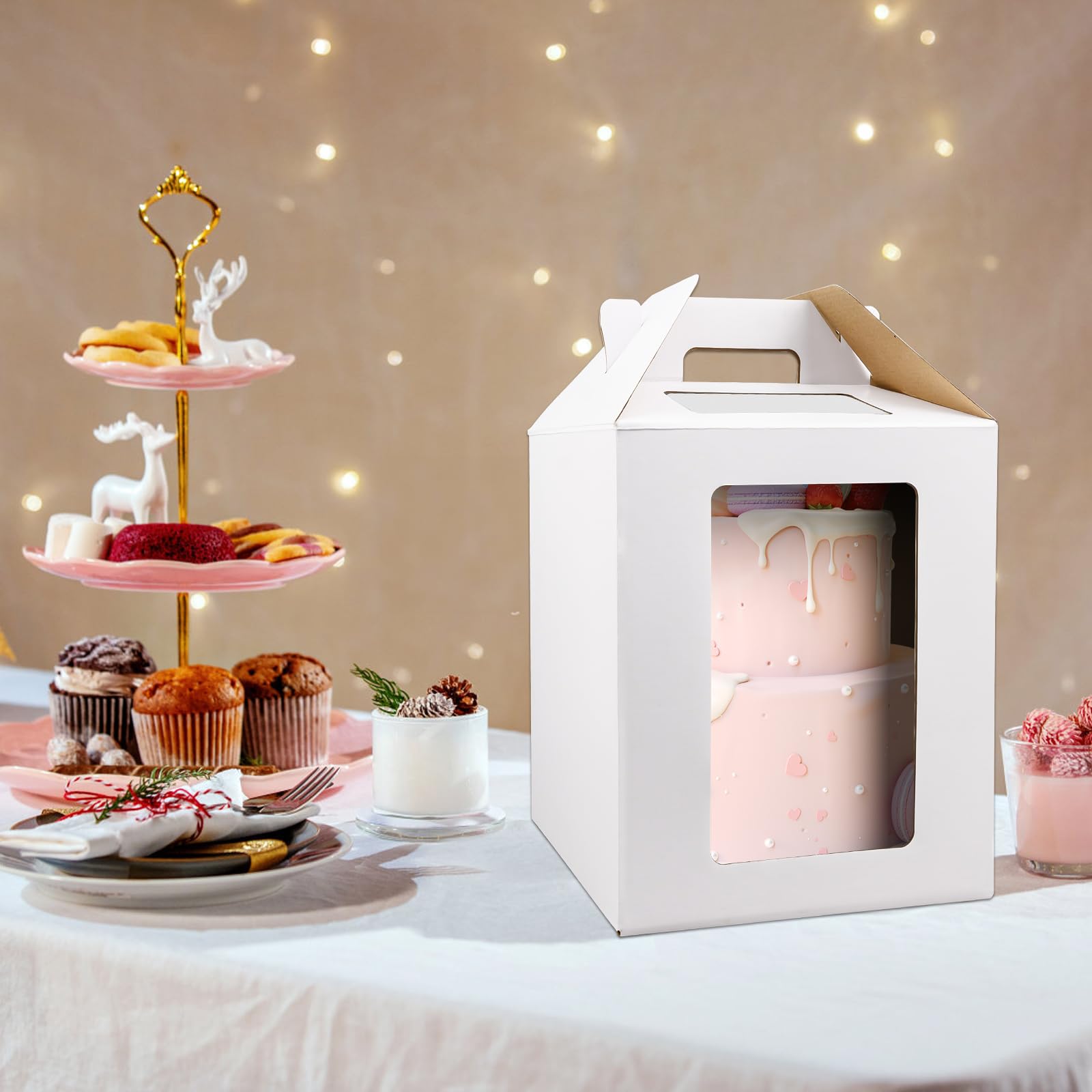 - ELEGANT LOOK: Show off your beautiful cake creations in these tall cake boxes. Our cake boxes are designed with a front and top window so you can display your tiered cakes in the box and keep an eye on them while transporting from your home bakery or a take-out from your bakery shop.