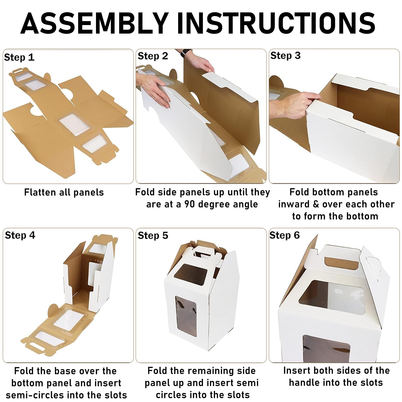 - EASY TO ASSEMBLE: Our 10x10 cake box with window and 12x12 cake box with window are quick and easy to assemble and come flat for easy storage, making them perfect for professionals, small bakeshops and home bakeries. Cake box with handle