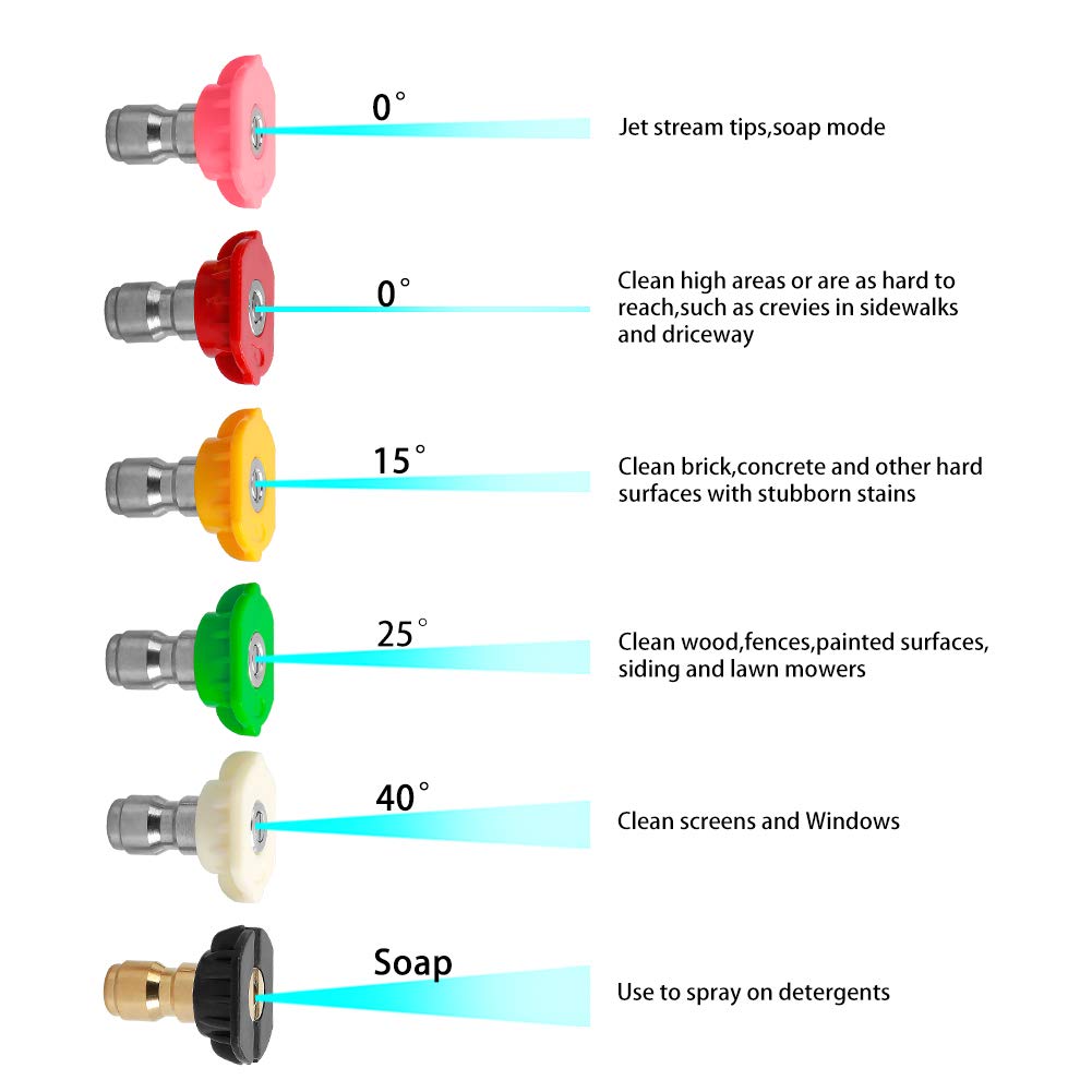 - ★【Compatibility & 6 PCS Gun Nozzle】Pressure washer gun 4000 PSI is compatible with gasoline powered and electric powered pressure washers. (Cold water use only) apply for pressure washer with 2.0GPM ~ 5.3Gpm flow rate, Minimum pressure: 70BAR - 1000PSI; Maximum pressure: 275BAR - 4000PSI. 6 PCS Spray Nozzle Tips -1/4 inch quick connection design -Red Nozzle (0 degree) -Yellow (15 degree) -Green (25 degree) -White (40 degree) -Black (fan-shaped soap) -Pink (cylindrical soap)