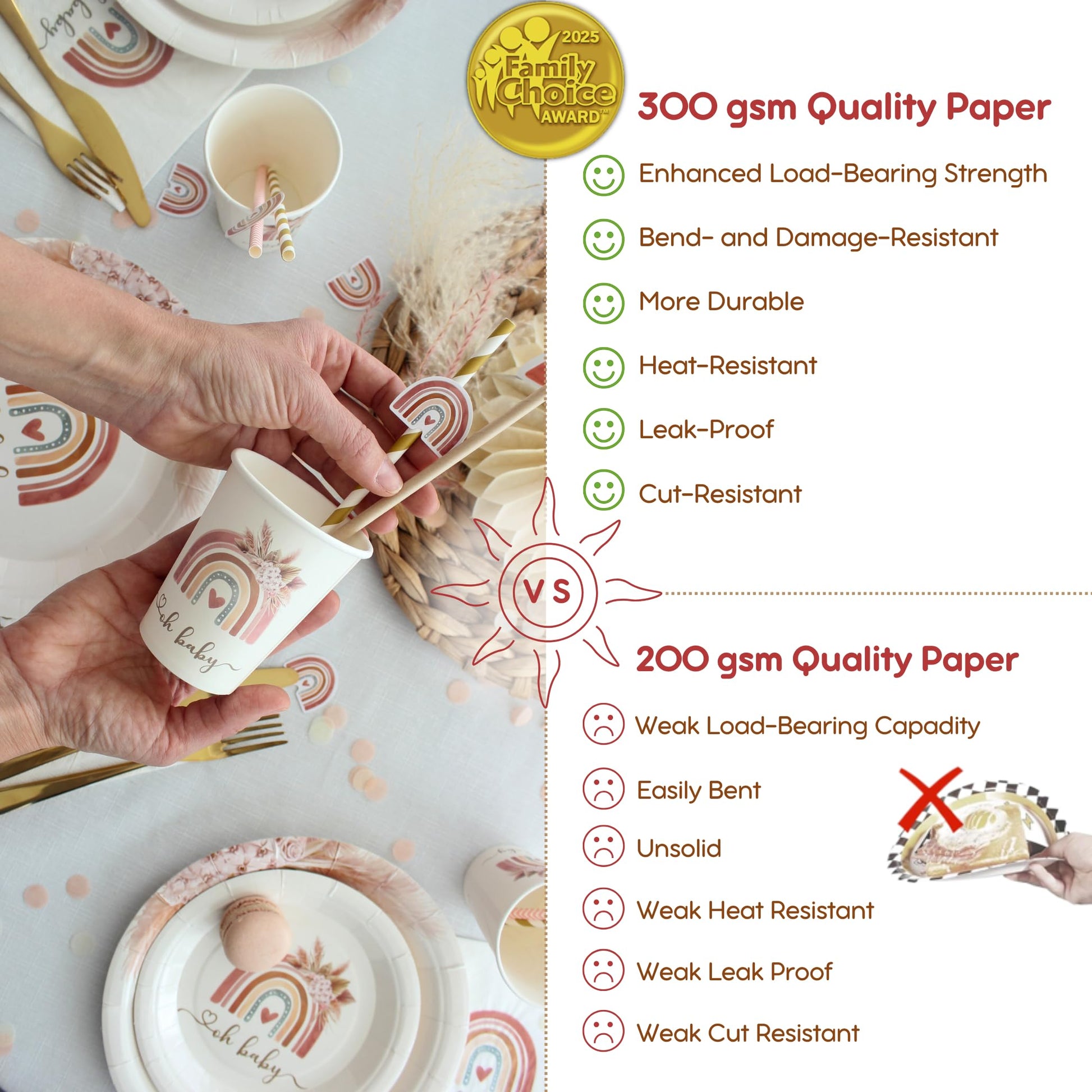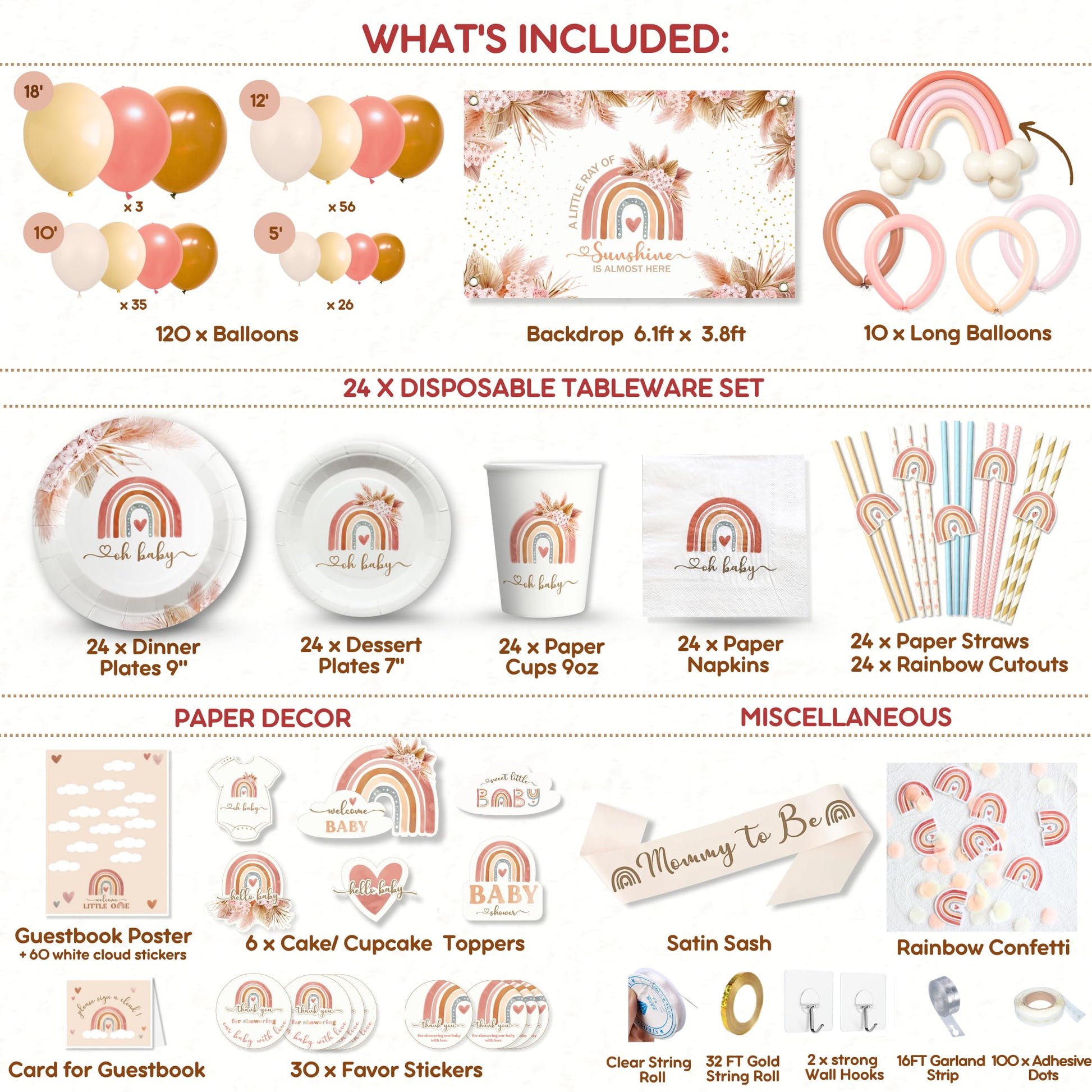 Details: Create the ultimate bohemian baby shower with our beautiful and unique boho rainbow party decorations. Our 408-piece boho baby shower decor set is perfect for girls and will add a touch of whimsy to your party. These boho rainbow baby shower decorations include a stunning backdrop, a beautiful balloon arch garland, plates, napkins, straws, and a sash for the guest of honor. Each pink and brown decoration is made with high-quality materials so they last the entire celebration and beyond, and can be used indoors or outdoors. Whether used as boho decorations for bedroom or as twin baby shower decorations, our decor kit is easy to set up and take down, making party preparation a breeze for the hosts. The rainbow and cloud theme baby shower decorations make a cheerful atmosphere great for photos to be shared on social media. Our bohemian baby shower decor is sure to impress your guests and make your baby shower a memorable event. Set includes 120 latex balloons in multiple sizes, 10 long balloons, 100 adhesive dots, 16 foot garland strip, 2 wall hooks, gold string roll, clear string roll, 24 boho baby shower plates for dinner (9"), 24 dessert plates (7"), 24 paper cups (9 oz.), 24 3-ply napkins, 24 paper straws with rainbow cutouts; 1 cake centerpiece, 5 cake toppers, 200 boho rainbow confetti, 30 favor stickers, 1 guestbook poster, 60 cloud stickers to write messages to stick on the poster, 1 sign card, satin sash.