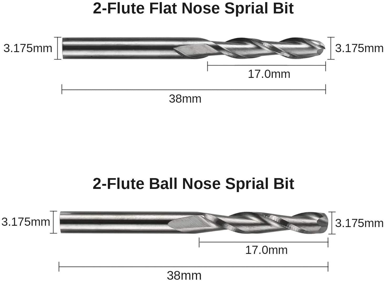 - 2-Flute Spiral Flat Nose & Ball Nose End Mills -- Shank Diameter: 3.175mm, Cutting Diameter: 3.175mm, Cutting Length: 17mm, Overall Length: 38mm.