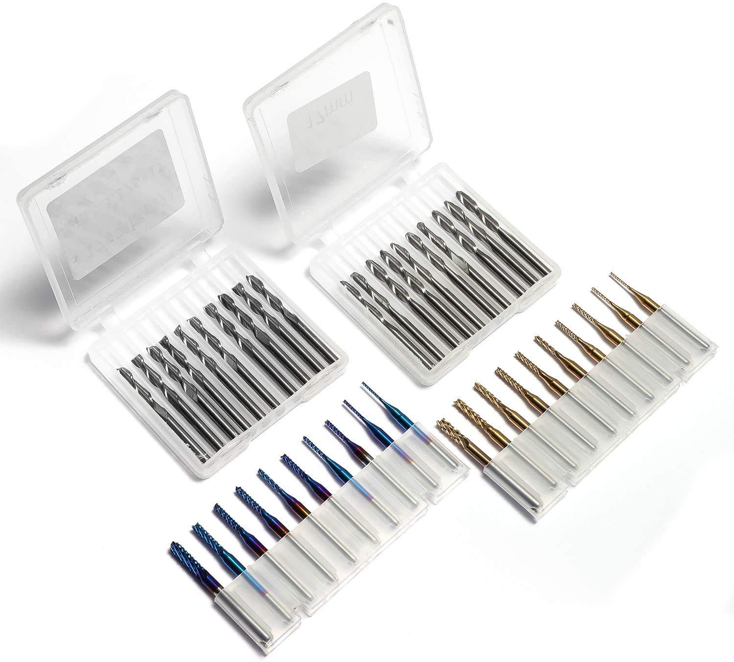 - Two End Mill Sets -- Shank Diameter: 3.175mm, Cutting Diameter: 0.8 - 3.0mm (0.8/1.0/1.2/1.4/1.6/1.8/2.0/2.2/2.5/3.0mm), Cutting Length: 17mm, Overall Length: 38mm, with Nano blue and Titanium coating.