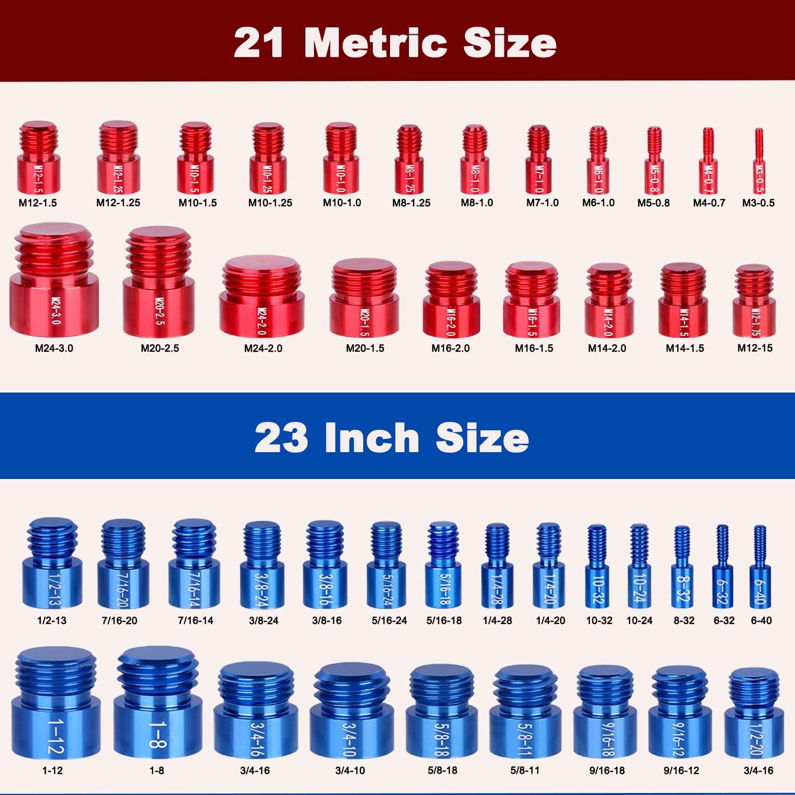 - 【23 Inch & 21 Metric】Inch in blue:1-12,1-8,3/4-16, 3/4-10, 5/8-18, 5/8-11, 9/16-18, 9/16-12, 1/2-20, 1/2-13, 7/16-20, 7/16-14, 3/8-24, 3/8-16, 5/16-24, 5/16-18, 1/4-28, 1/4-20, 10-32, 10-24, 8-32, 6-40, 6-32; Metric in red: M3-0.5, M4-0.7, M5-0.8, M6-1.0, M7-1.0, M8-1.0, M8-1.25, M10-1.0, M10-1.25, M10-1.5, M12-1.25, M12-1.5, M12-1.75, M14-1.5, M14-2.0,M16-1.5, M16-2.0, M20-1.5, M20-2.5, M24-2.0, M24-3.0; (bolt and nut thread identifier, thread gauge sae and metric)