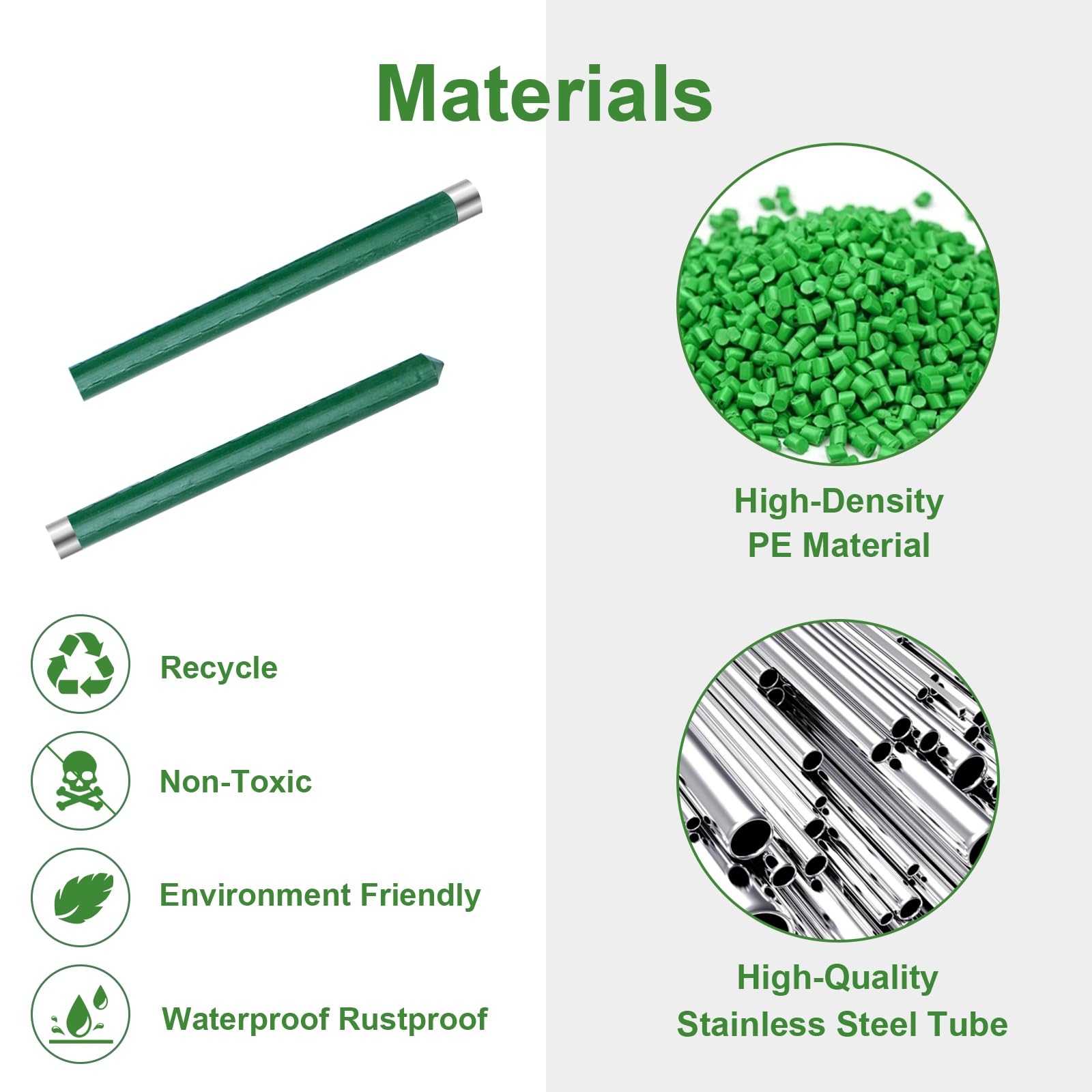 - High Quality Material: The garden stakes are made of thicken stainless steel pipes coated with recyclable high molecular density plastic, which is an environmentally friendly material that will never be harmful to plants.