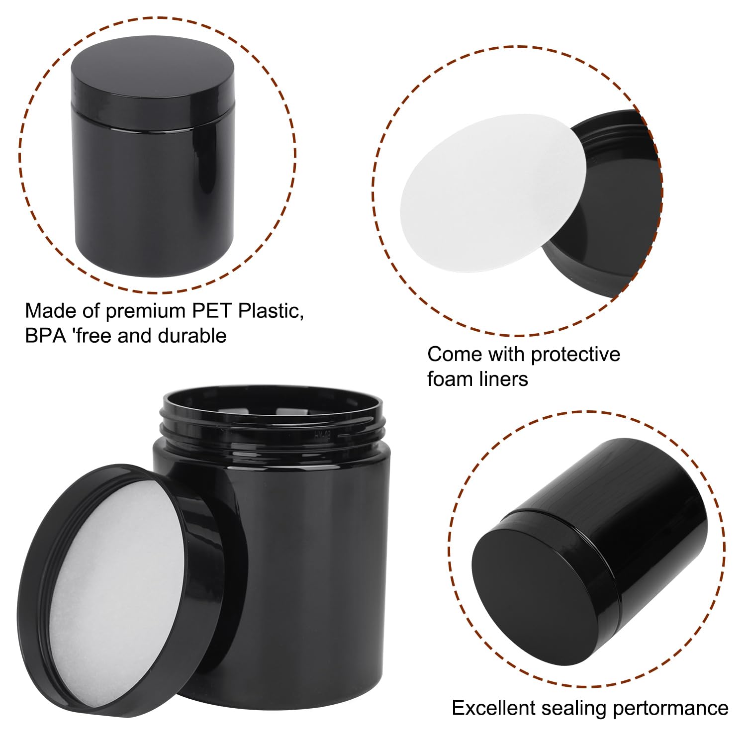 - 【Leakproof And Tight Seal】: The foam pad on the lids enhances the sealing, preventing water seepage and leakage. Your belongings are protected when the lid is securely screwed onto the 8 oz plastic jars.