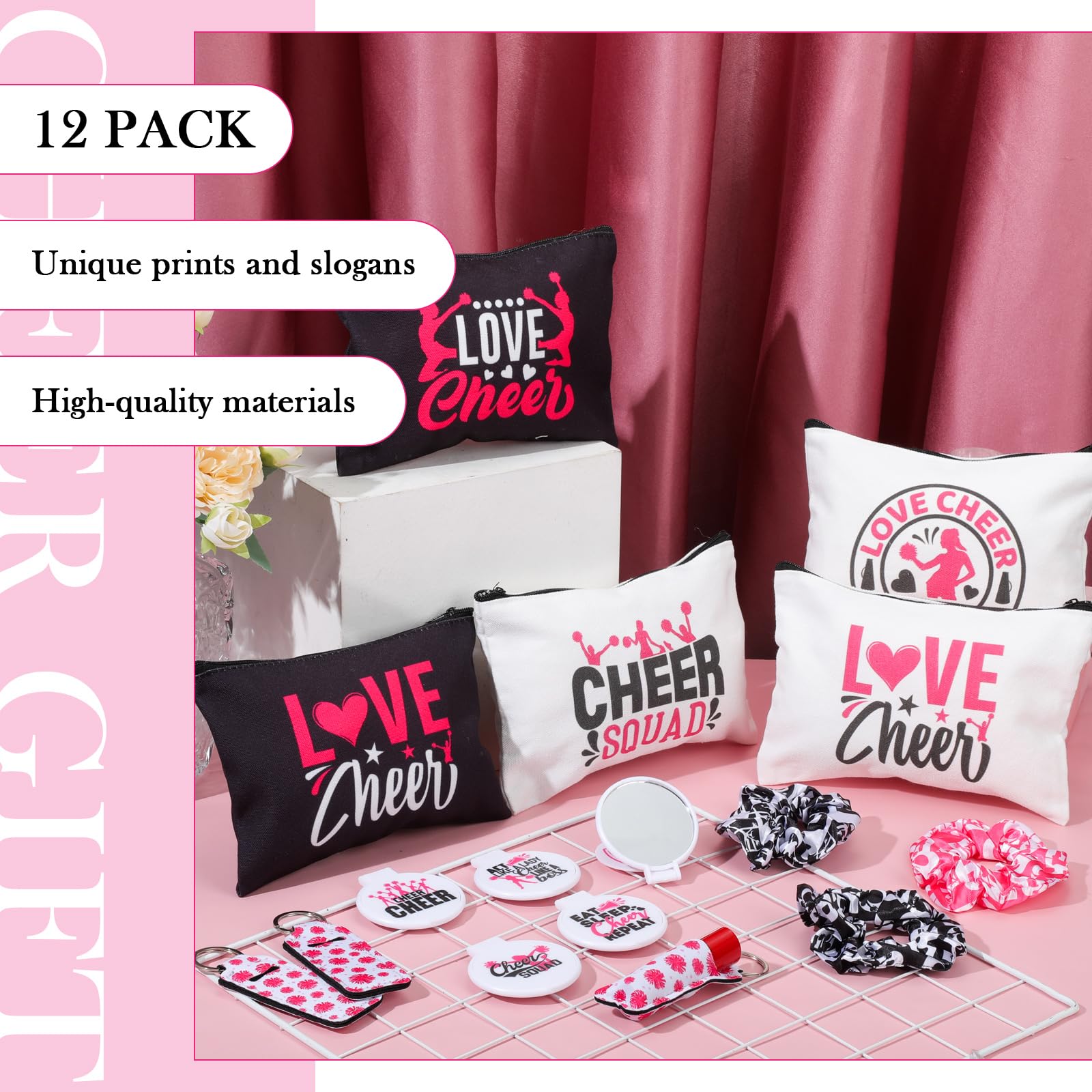 - Package Includes: there are 12 sets of cheerleaders cheer gifts in the package, including 12 pieces of makeup bags, 12 pieces of cheerleading hair ties, 12 pieces of folding makeup mirrors, 12 pieces of lipstick holder keychains, convenient to use and can serve you for a long time