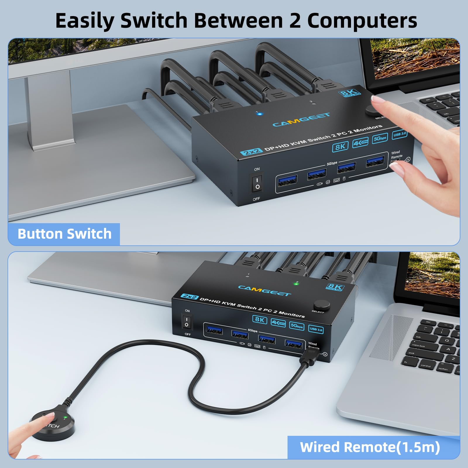 4K@144Hz KVM Switch 2 Monitors 2 Computers 8K@60Hz,Camgeet HDMI and Displayport Dual Monitor KVM Switch with 4 USB 3.0 Port for Keyboard Mouse Printer,Wired Remote,Power Adapter and USB Cable Included