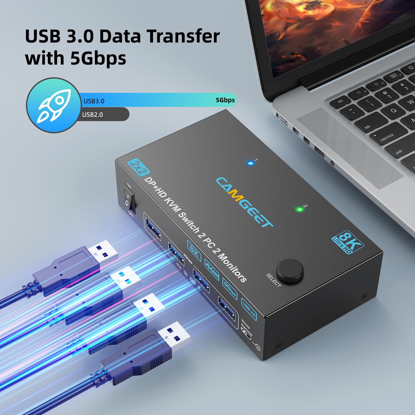 - 【Ultra HD 8K Visual Effect】Camgeet HDMI 2.1 Displayport 1.4 dual monitor KVM Switch supports up to 8K@60Hz, 4K@144Hz resolutions and is backward compatible, providing an incredible viewing experience with realistic images and vibrant colors.