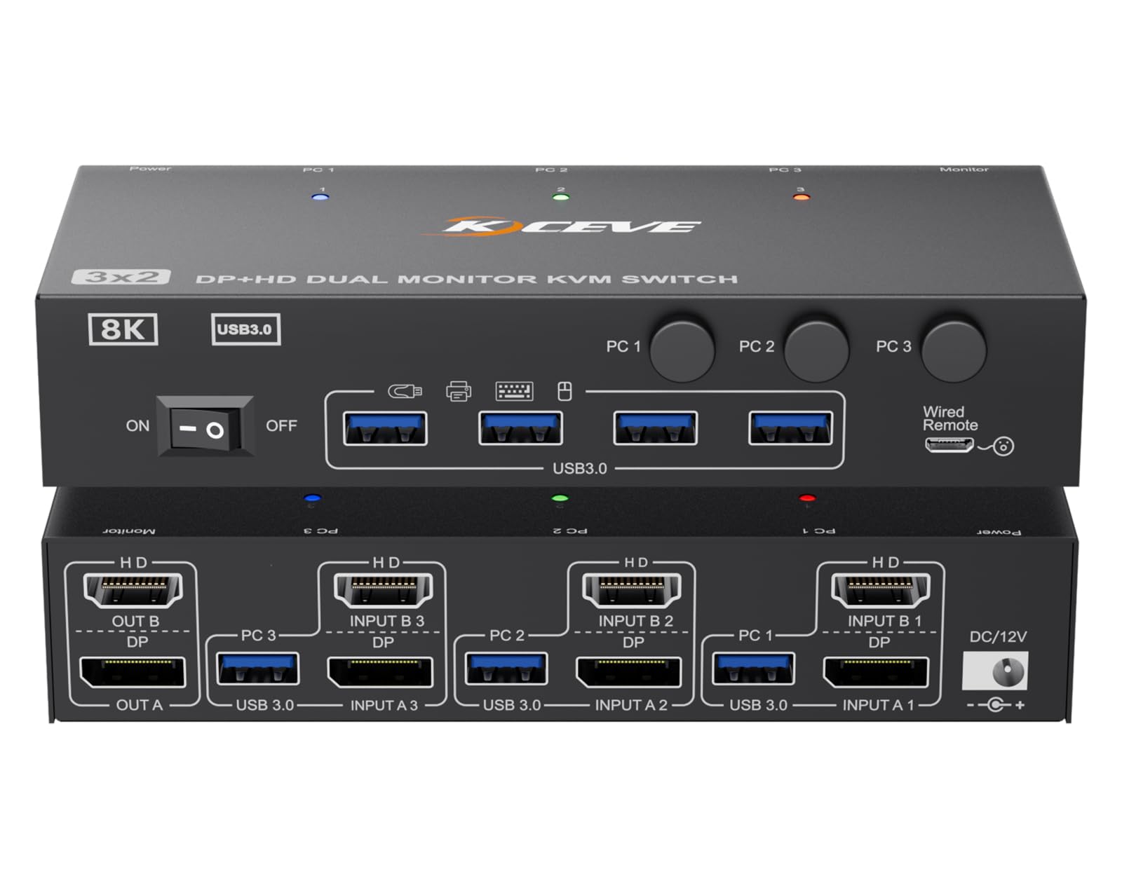 4K@144Hz KVM Switch 2 Monitors 3 Computers 8K@60Hz,Camgeet HDMI and Displayport Dual Monitor KVM Switch with 4 USB 3.0 Port for Keyboard Mouse Printer,Wired Remote,Power Adapter and USB Cable Included