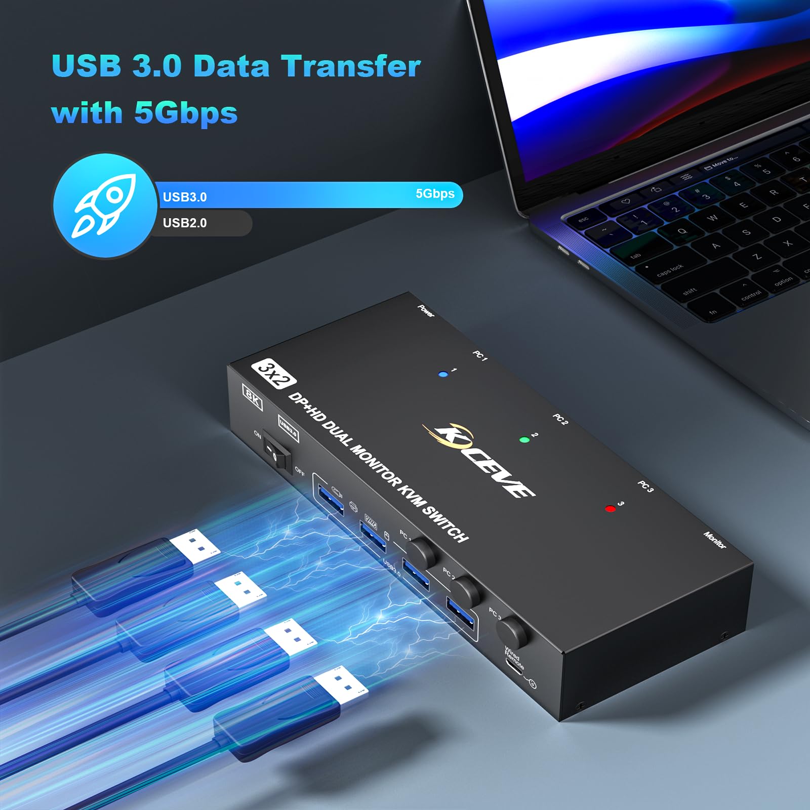 - 【5Gbps Ultra-fast Transfer】USB 3.0 KVM switch 3 computers 2 monitors transfer files in Seconds.This dual display KVM Switch supports ultra-fast USB 3.0 data transfer rates of up to 5Gb/s. With 4 USB3.0 ports for peripheral USB devices such as keyboard, mouse, printer, etc., backward compatible with USB2.0/1.1.Support wireless keyboard and mouse.