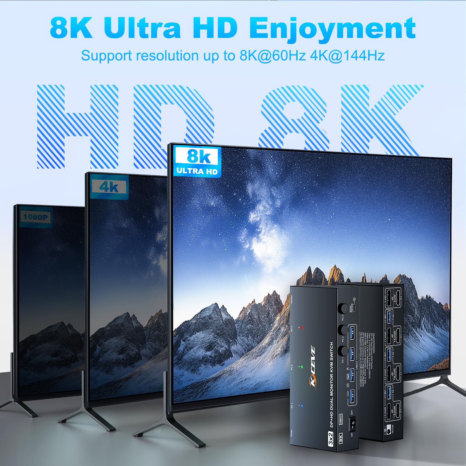 - 【Ultra HD 8K Visual Effect】Camgeet HDMI 2.1 Displayport 1.4 dual monitor KVM Switch supports up to 8K@60Hz, 4K@144Hz resolutions and is backward compatible, providing an incredible viewing experience with realistic images and vibrant colors.
