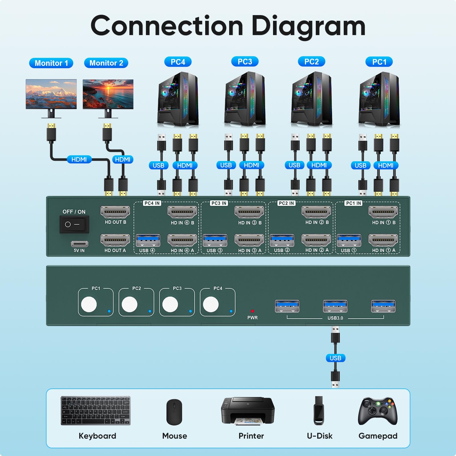 4K@60Hz HDMI KVM Switch 4 Computers 2 Monitors USB3.0, 4 Ports KVM Switch Dual Monitor with 3 USB3.0 Ports Sharing Keyboard and Mouse, Printer/Scanner, Desktop Controller
