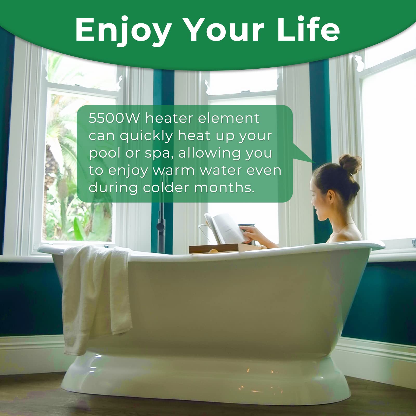 - ENERGY & SAFETY - 5.5Kw 240V heating element for hot tub can quickly heat up your pool or spa and you can enjoy warm water even during colder days. And this hot tub heater replacement is equipped with a high-limit thermostat and it will automatically stops heating when the temperature exceeds the limit.