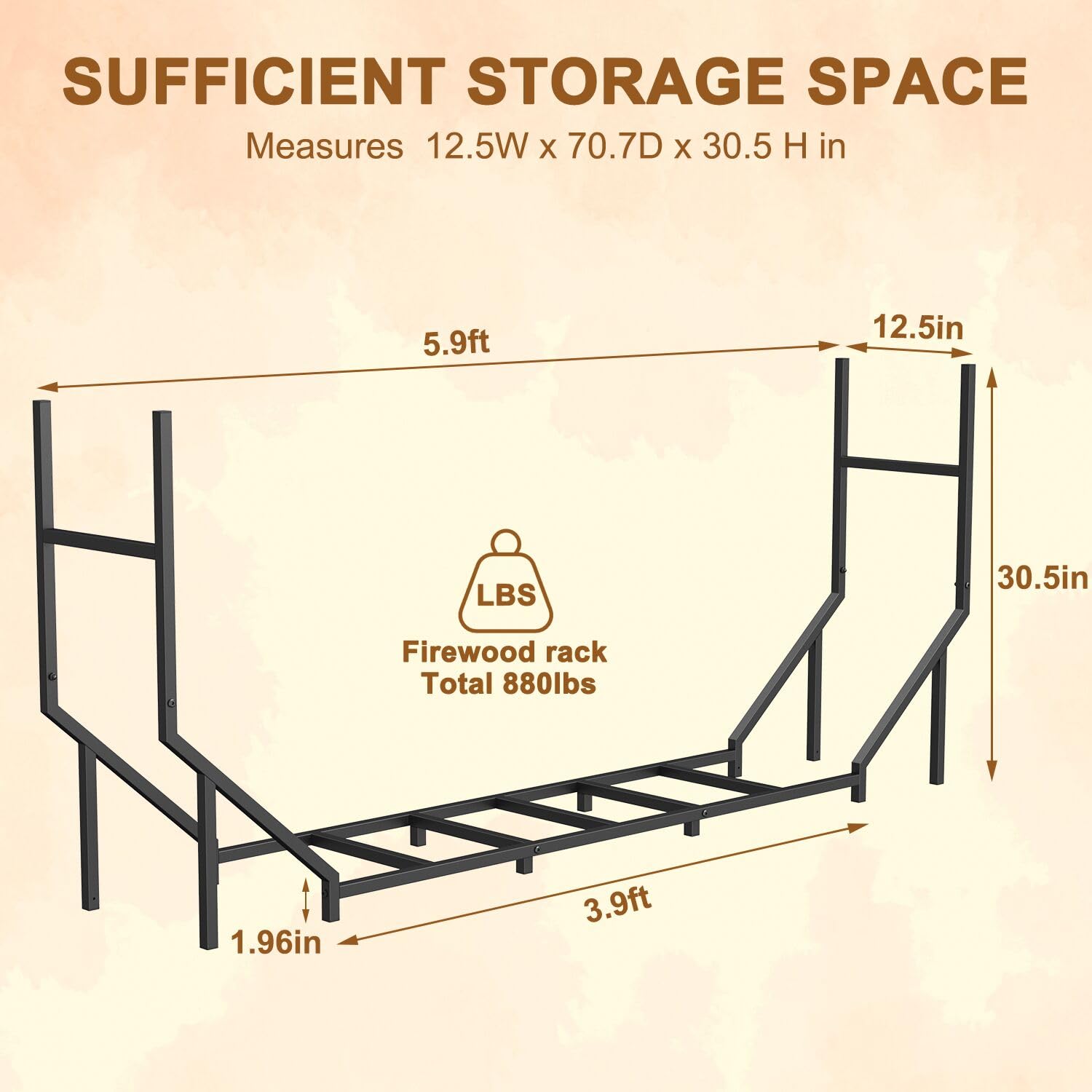 - WIDE APPLICATION: 5.9ft Fireplace Log Rack measures 12.5" W x 70.7" D x 30.5" H. Firewood storage rack to fit on outdoor back porch, back yard deck, outside backyard fire pits, under eaves, tool shed, wood shed, chaotic pile inside the cabin, indoor garage, family room, covered patio to hold enough wood for fireplace all seasons.