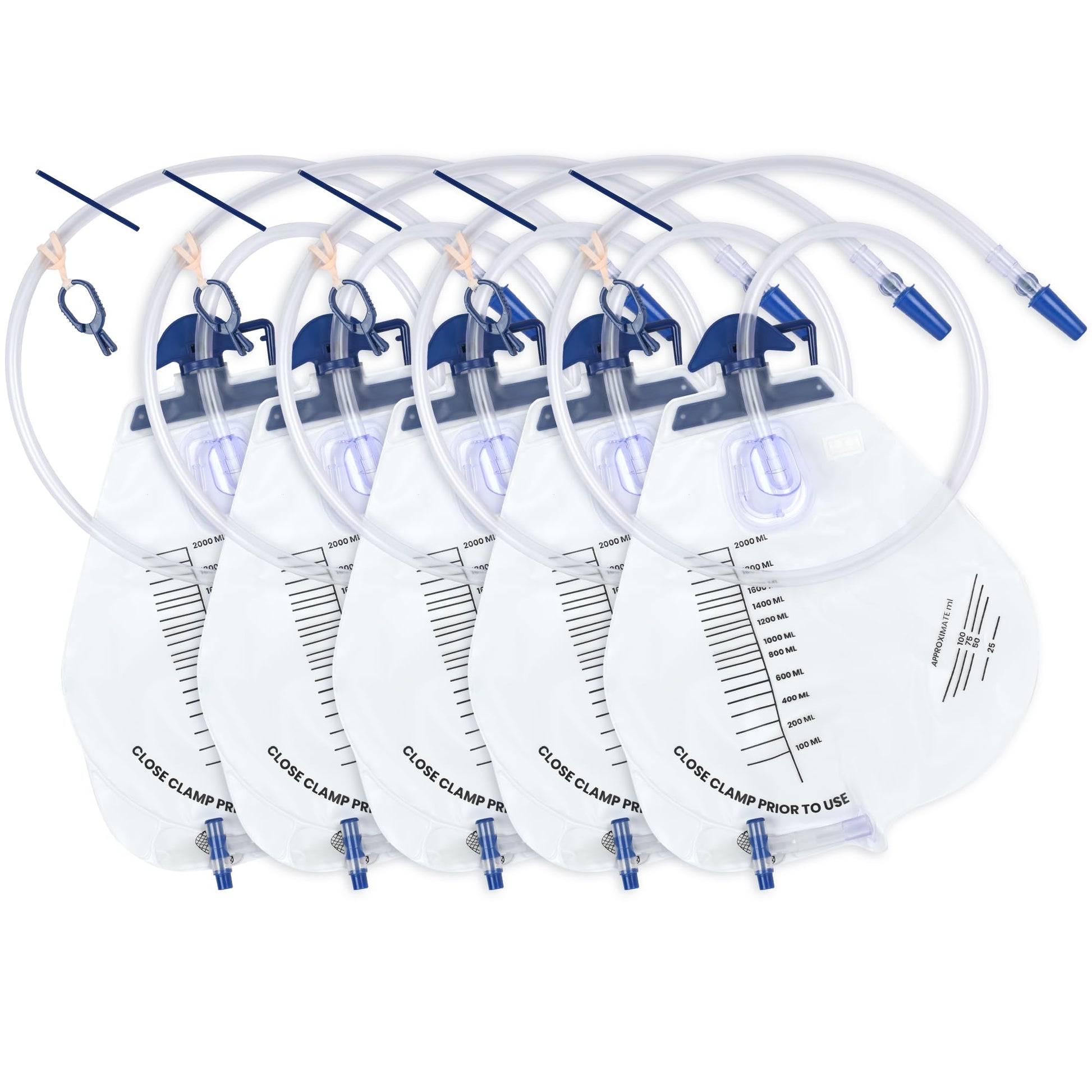5 Pack BeHerk Catheter Bags for Men and Women, 2000mL Professional Urinary Drainage Bag with Anti-Reflux Drip Chamber, 48” Overnight Drainage Tube, Adjustable Clips & Hanging Hook