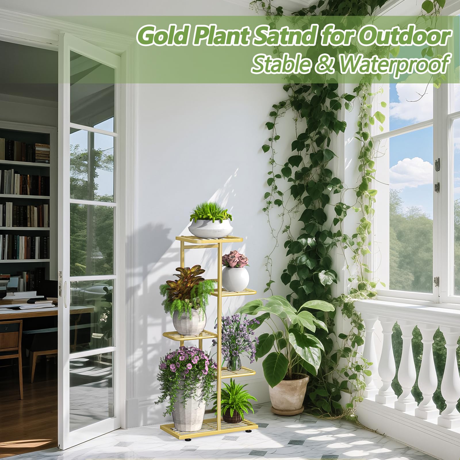 5 Tier 6 Potted Gold Plant Stand Indoor Outdoor, Upgraded Corner Metal Plant Rack Units Shelf for Multiple Plants, Flower Pot Holder Display for Patio, Balcony, Living Room
