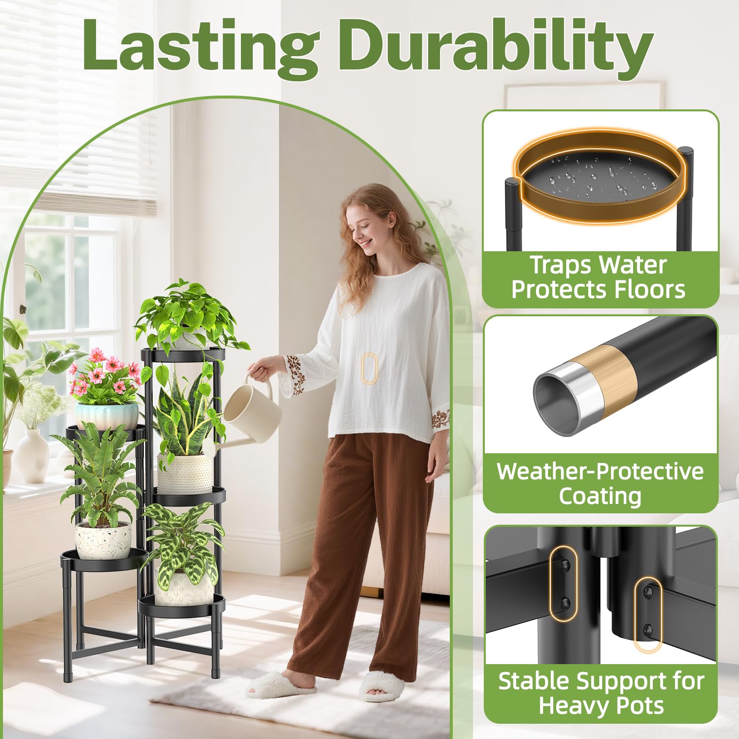5 Tier Metal Plant Stand for Indoor Outdoor, iDavosic.ly Foldable Corner Tall Plant Shelf for Multiple Plants, Rustproof Flower Pot Holder Display Stand for Living Room Balcony Garden Patio (Black)