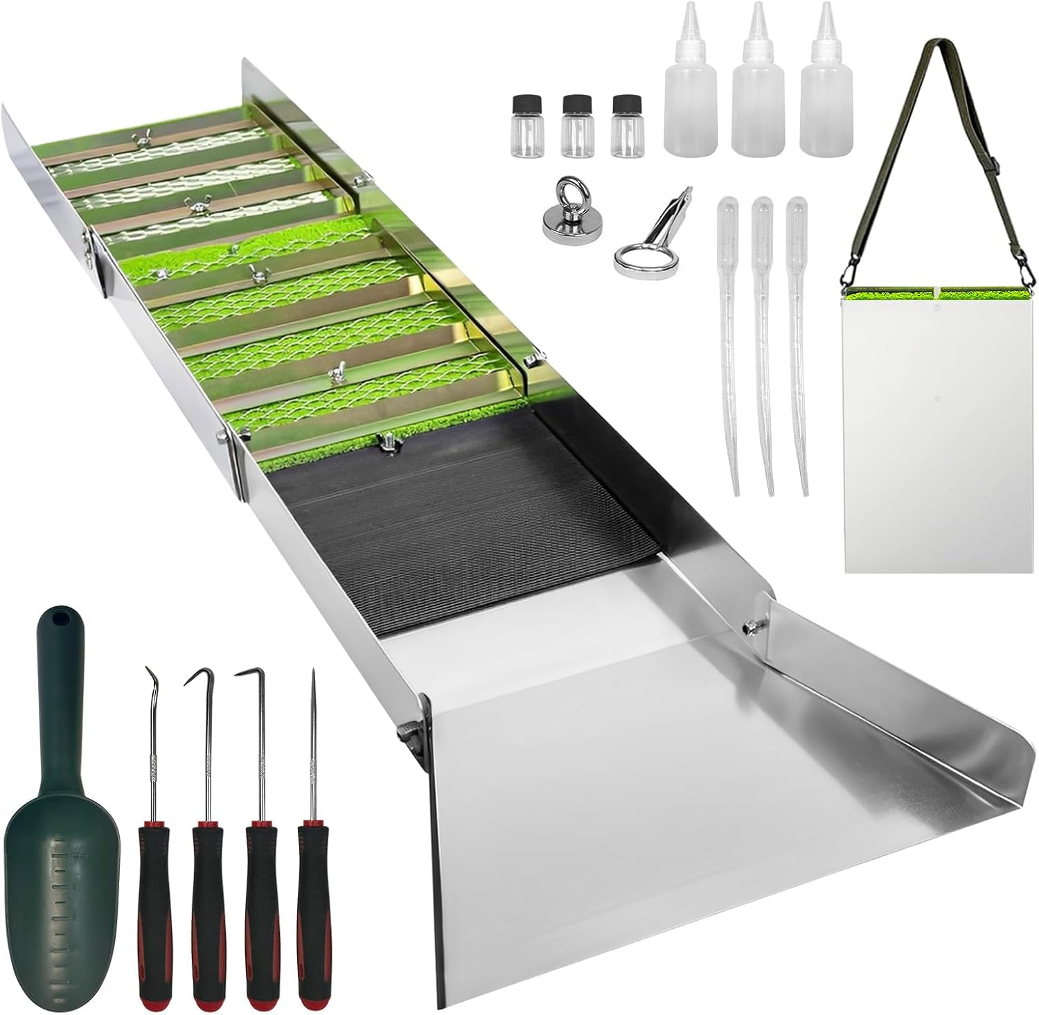 - 19PCS Gold Prospecting Kit: Our 19-piece gold panning kit includes everything you need, including50" folding sluice, 4 crevice picks, 1 magnifier tweezers, 1 gold-separating magnet, 3 snuffer bottles, 3 storage vials, 3 pipettes, paydirt scoop and 1 drawstring backpack