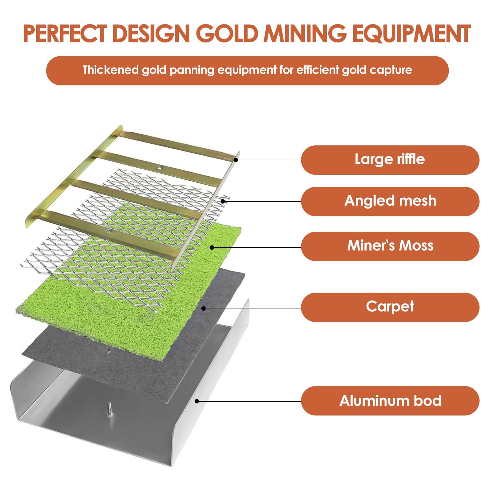 - Productive Gold Recovery: The thickened gold mining's moss features more crevices and grooves, which allows gold particles and other heavy materials to settle effectively on the mat. Thesluice box for gold mining efficiently washes away light sand and worthless impurities, saving you time and resources so you can concentrate on finding valuable gold